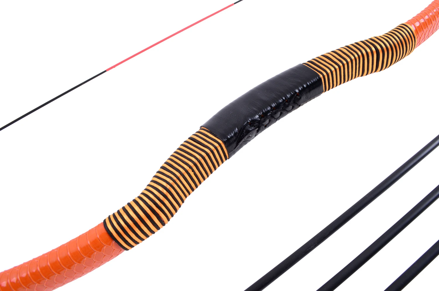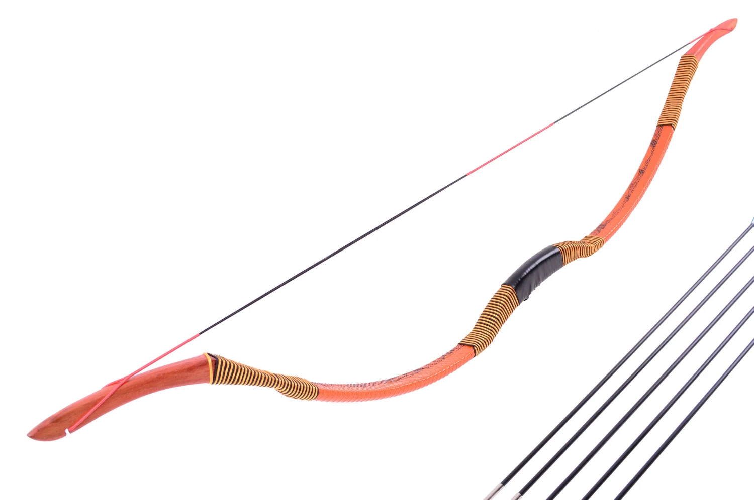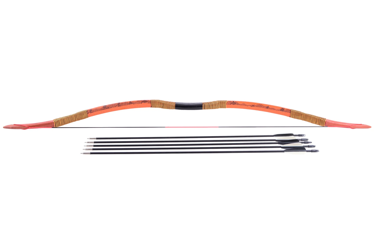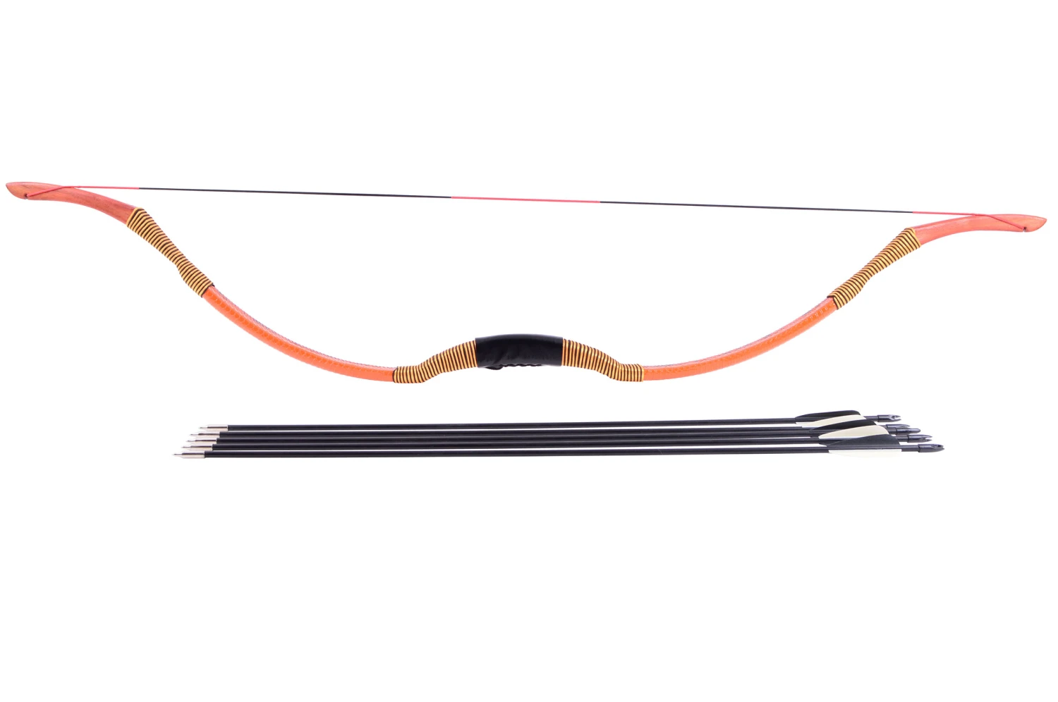 Arc chinois traditionnel et ses cinq flèches, fabriqué à la main par des artisans. Modèle milieu de gamme avec une tension peu élevée, conviendra parfaitement aux débutants.
