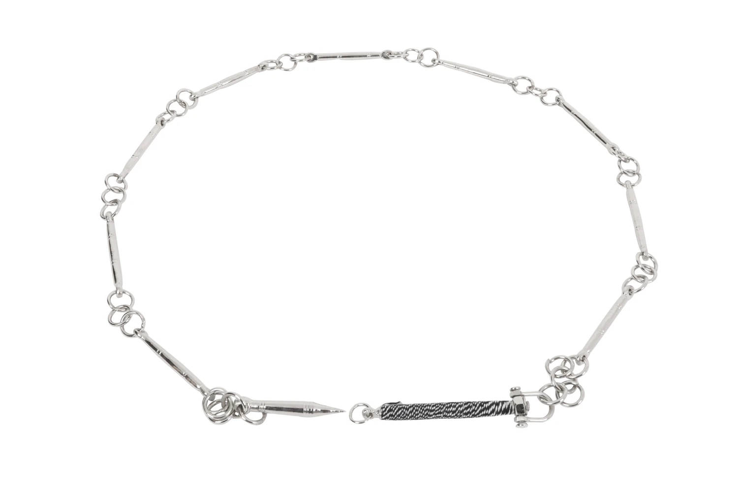 Chaîne composée de sections articulées, d’une pointe et d’une poignée. Les sections sont rattachées entre-elles par trois anneaux métalliques fermés par une soudure. Tous les élements de la chaîne sont en métal. Le nombre de sections ne prend pas en compte la poignée et la pointe.