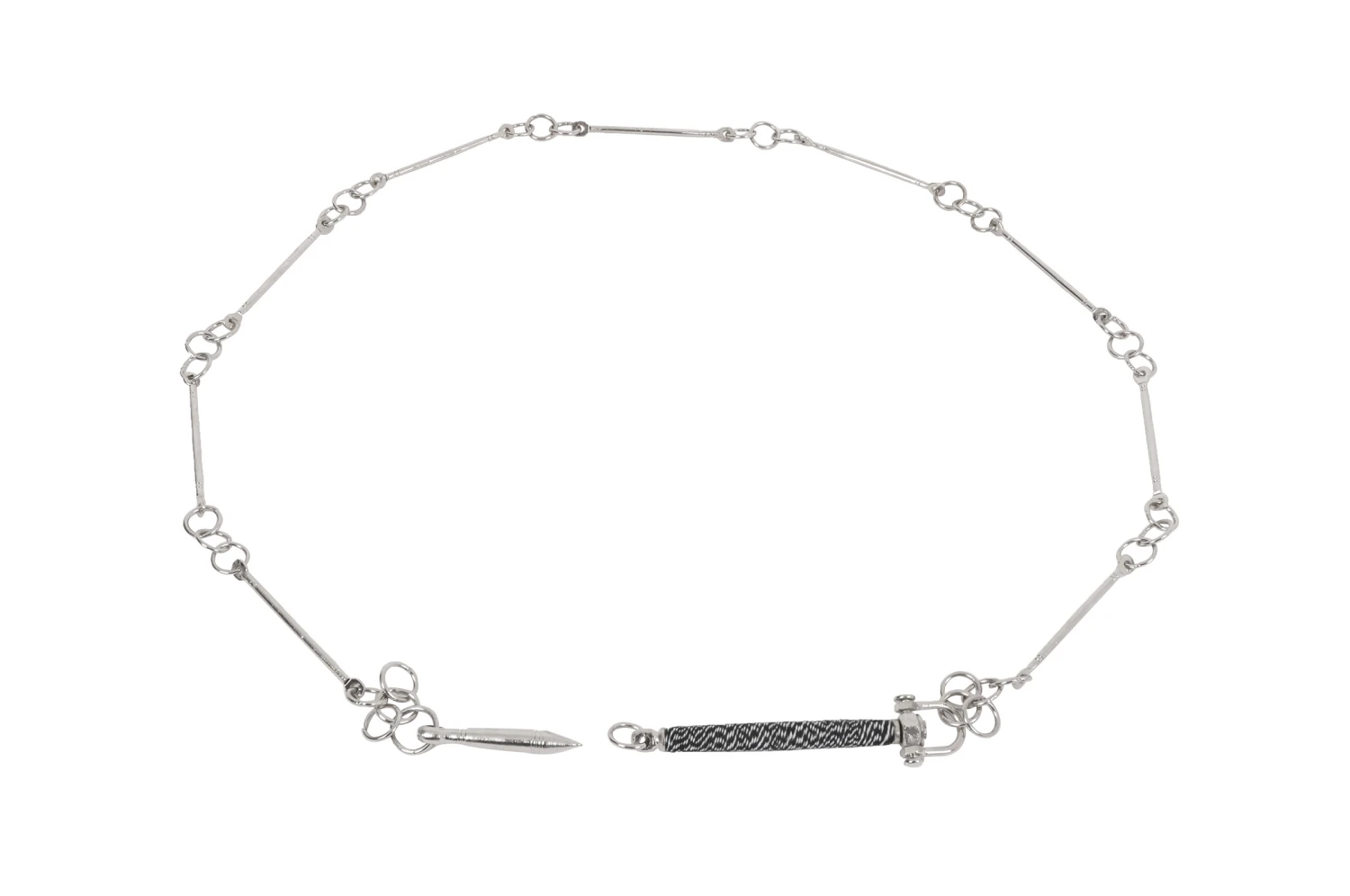 Chaîne composée de sections articulées, d’une pointe et d’une poignée. Les sections sont rattachées entre-elles par trois anneaux métalliques fermés par une soudure. Tous les élements de la chaîne sont en métal. Le nombre de sections ne prend pas en compte la poignée et la pointe.