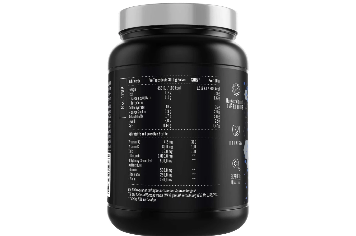 maltodextrine, isolat de protéines de pois, concentré de protéines de riz, épaississant : gomme de guar, L-glutamine 3,3 %, arôme naturel, bêta-hydroxy-bêta-méthylbutyrate de calcium (HMB) 1,9 %, L-leucine 1,7 %, L-isoleucine 0,8 %, L-valine 0,8 %, arôme, acidifiant : acide citrique, sel de table, colorant : bêta-carotène, LAscorbate de calcium, picolinate de zinc, édulcorant : sucralose, chlorhydrate de pyridoxine.
