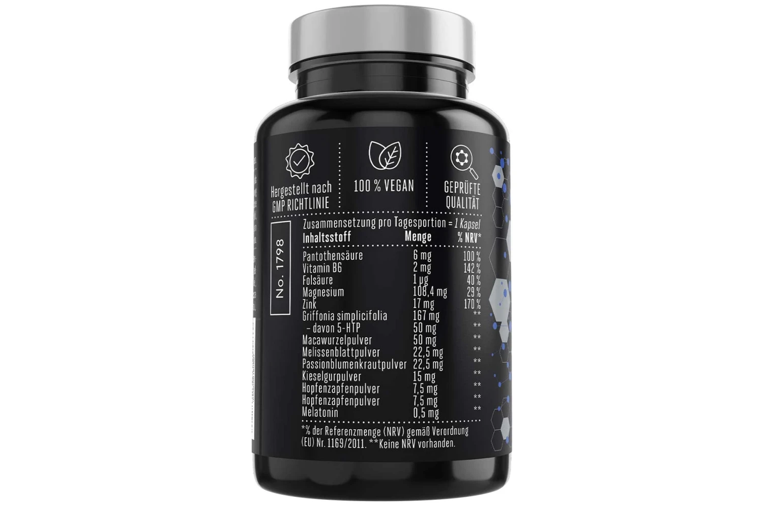 Oxyde de magnésium, extrait de graines de Griffonia simplicifolia (30 % de 5-hydroxytryptophane (5-HTP)), agent d’enrobage : hydroxypropylméthylcellulose (enveloppe de la capsule végétale), poudre de racine de maca, poudre de feuilles de mélisse, poudre de passiflore, oxyde de zinc, poudre de kieselguhr, poudre de pantothénate de calcium, houblon Chlorhydrate de pyridoxine, mélatonine, acide ptéroylmonoglutamique, cyanocobalamine.