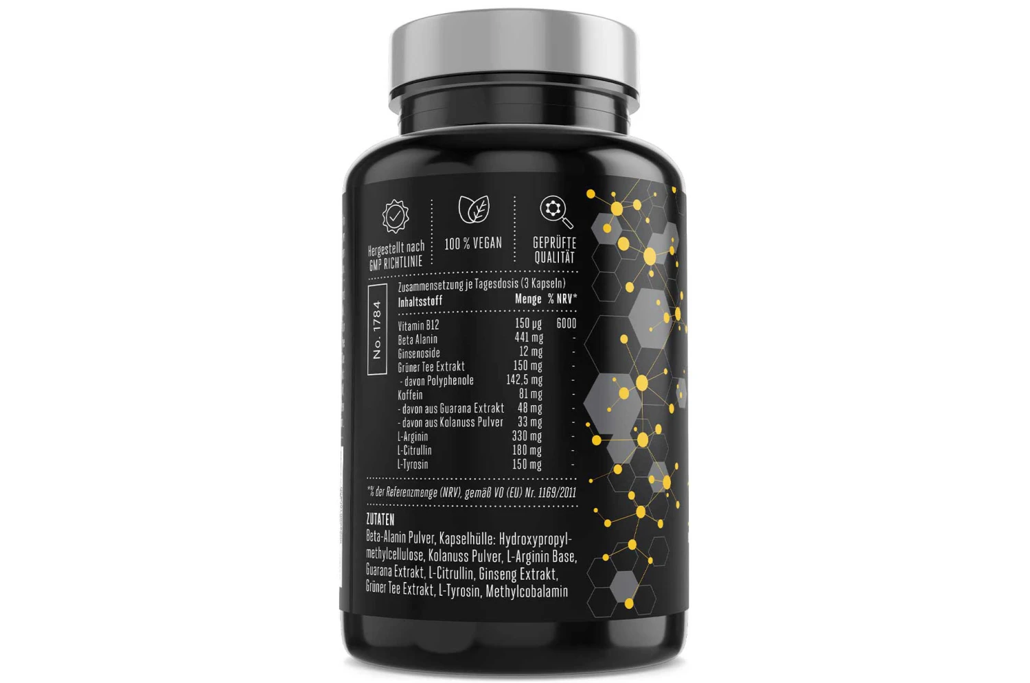 - Avec de la vitamine B12, de la bêta-alanine, du guarana et de la noix de cola.