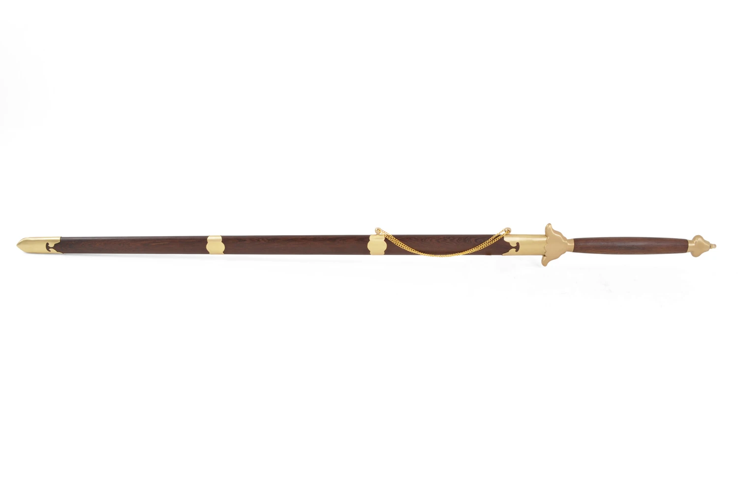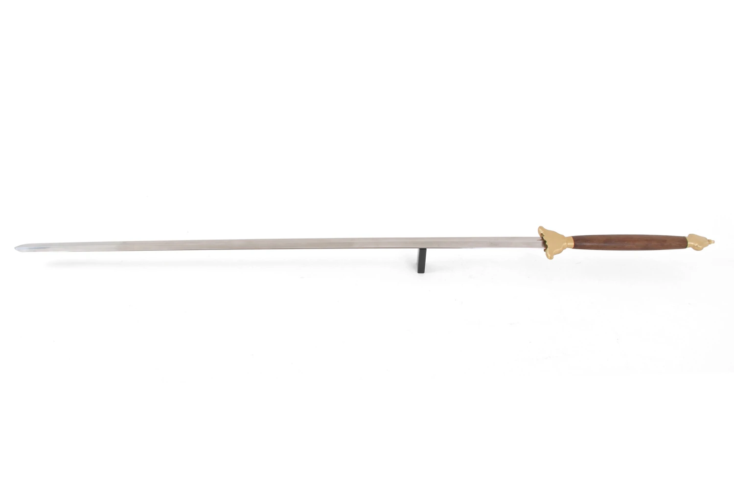 Épée de grande qualité, se maniant à deux mains. Lame rigide en acier inoxydable, bien équilibrée. Vendu avec son fourreau en bois. Pompon en option.
