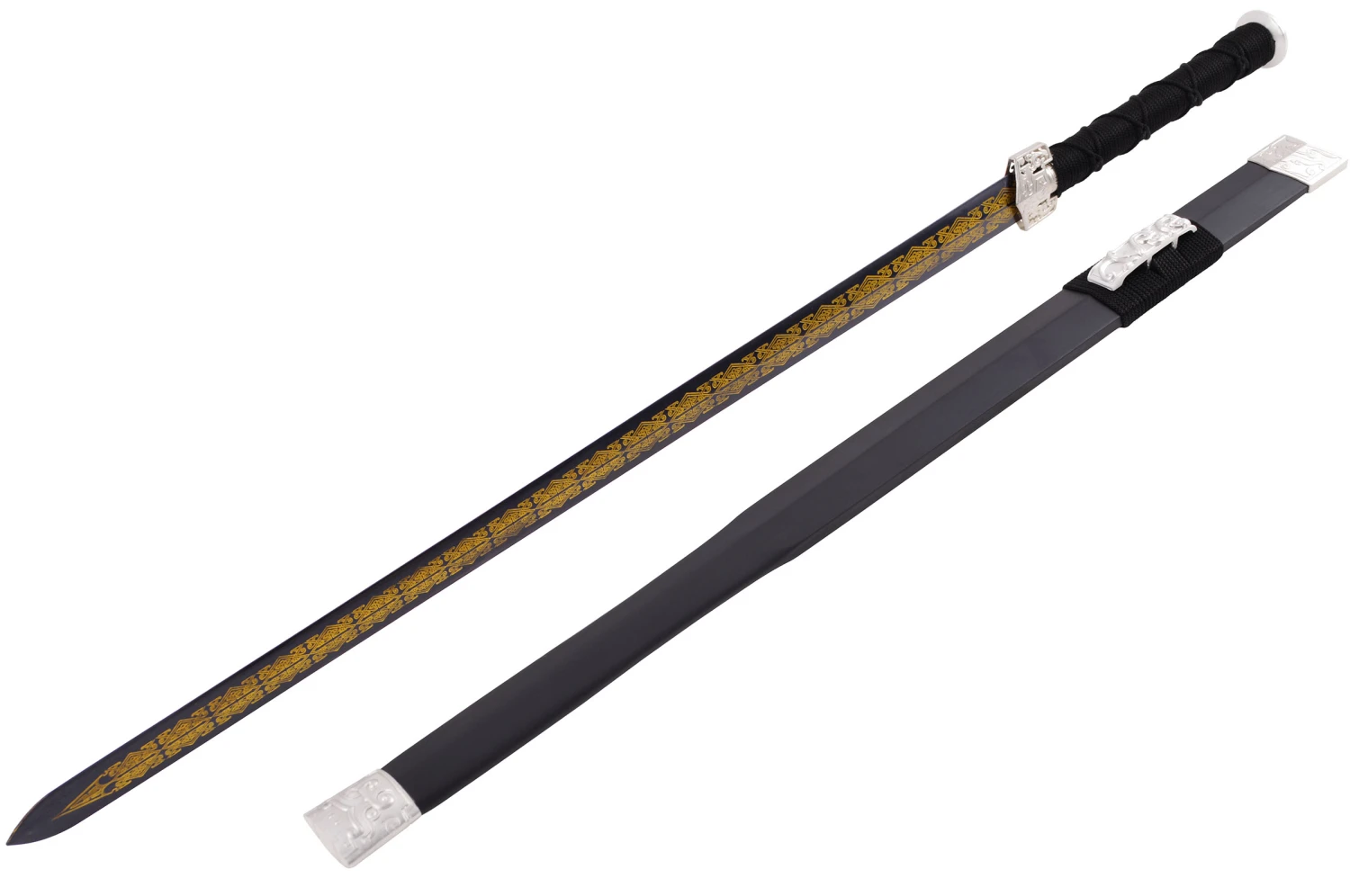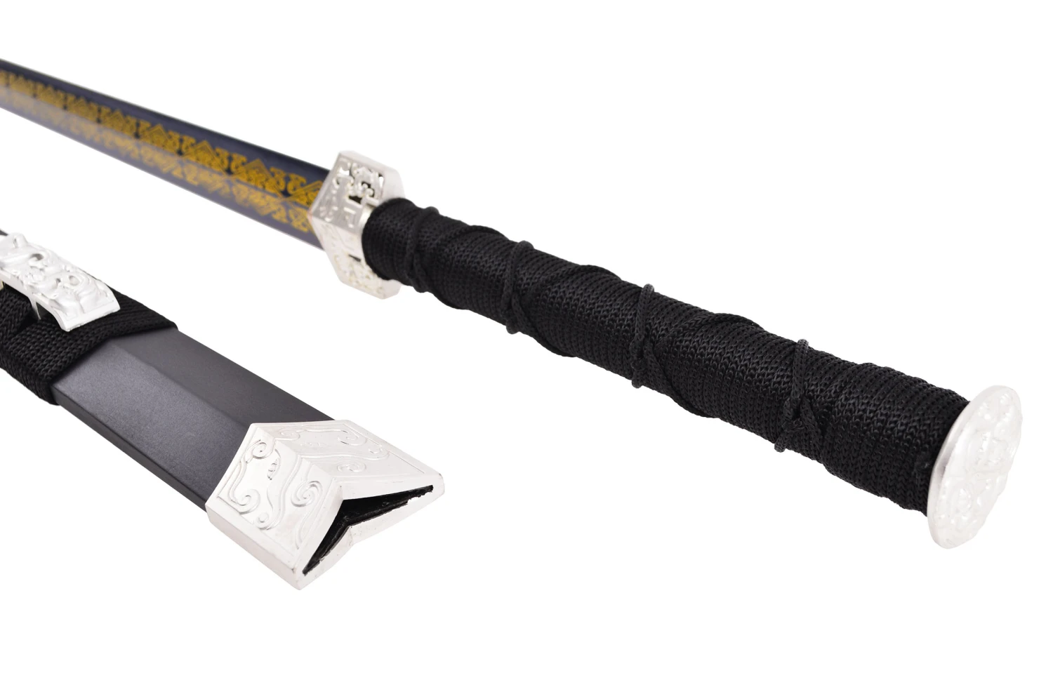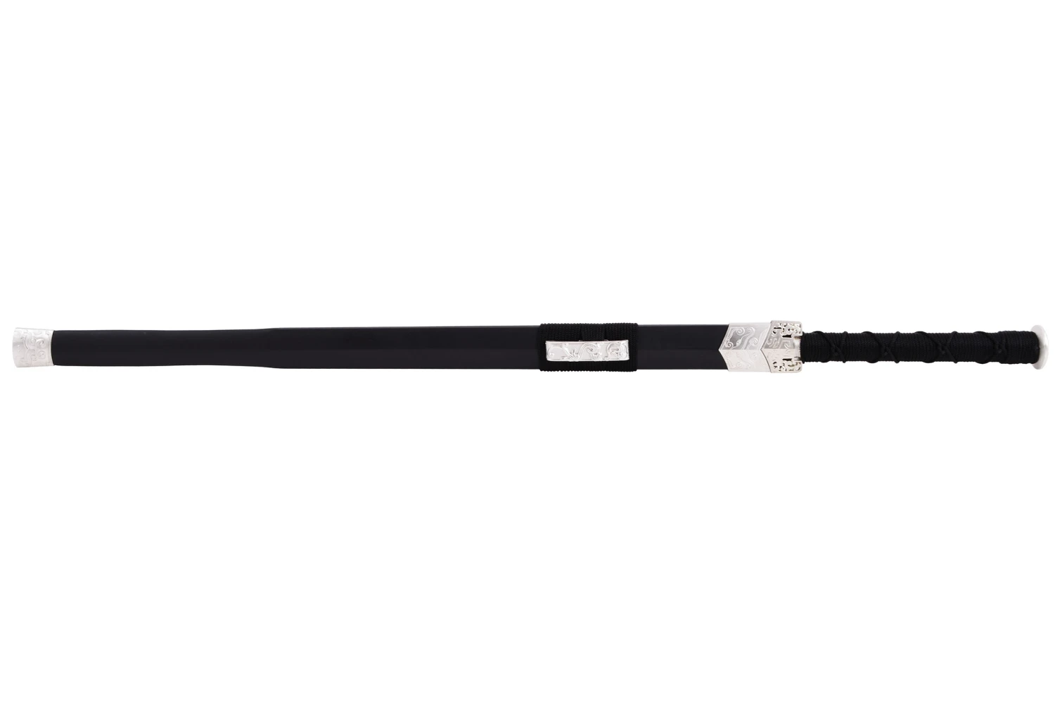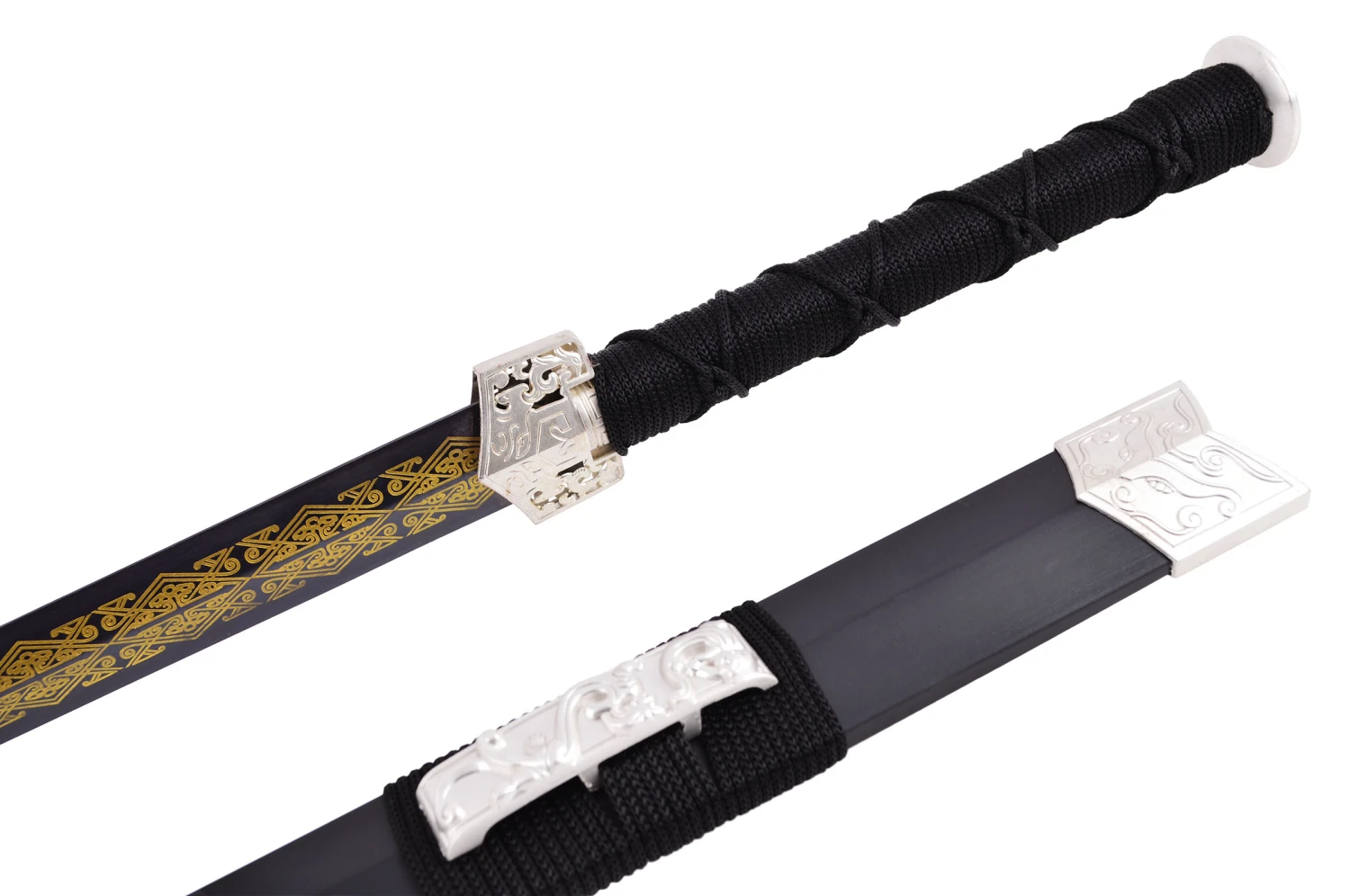 Épée avec fourreau noir, et pièces ornementales en métal blanc et lame noire avec motif doré.