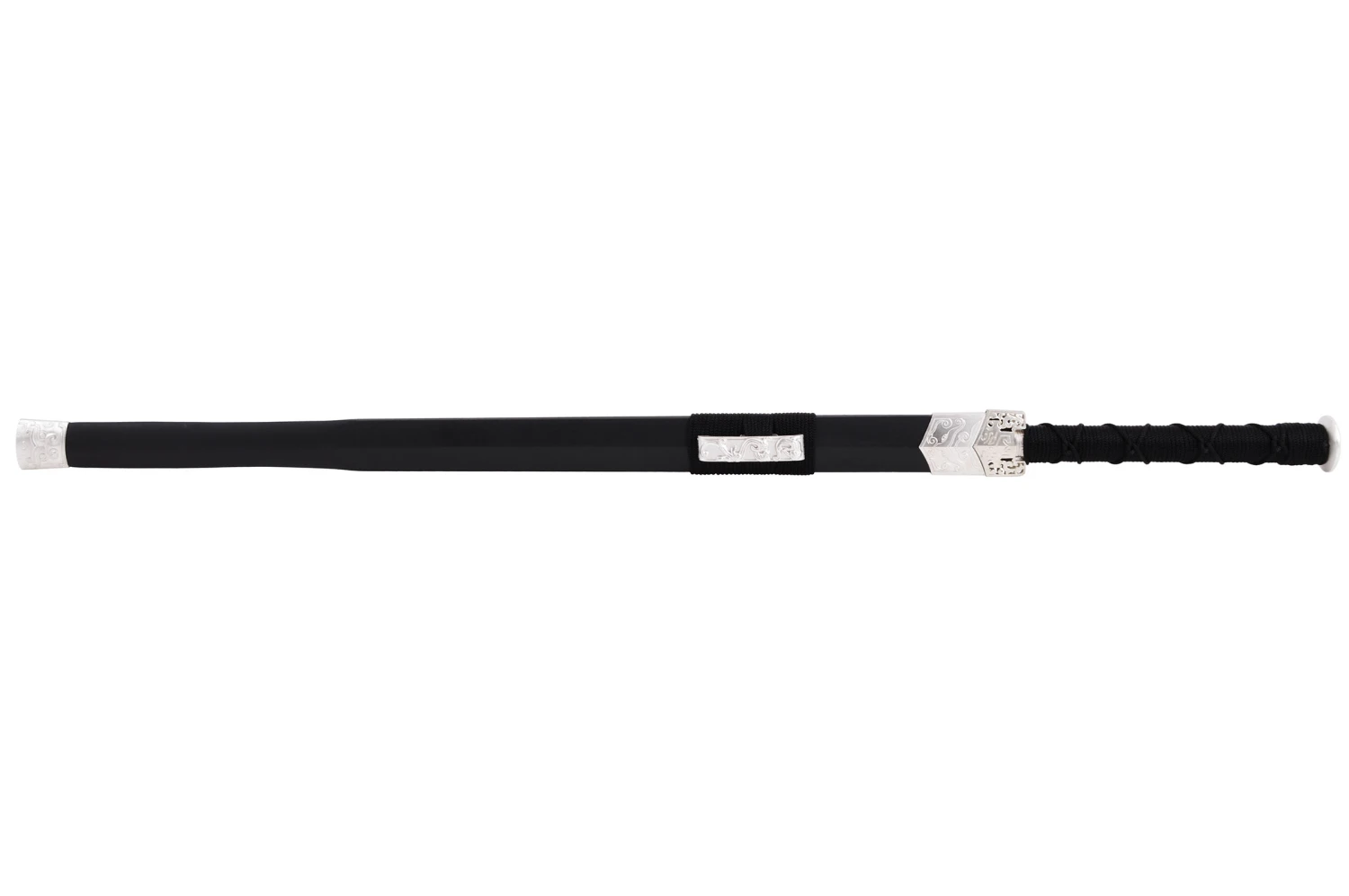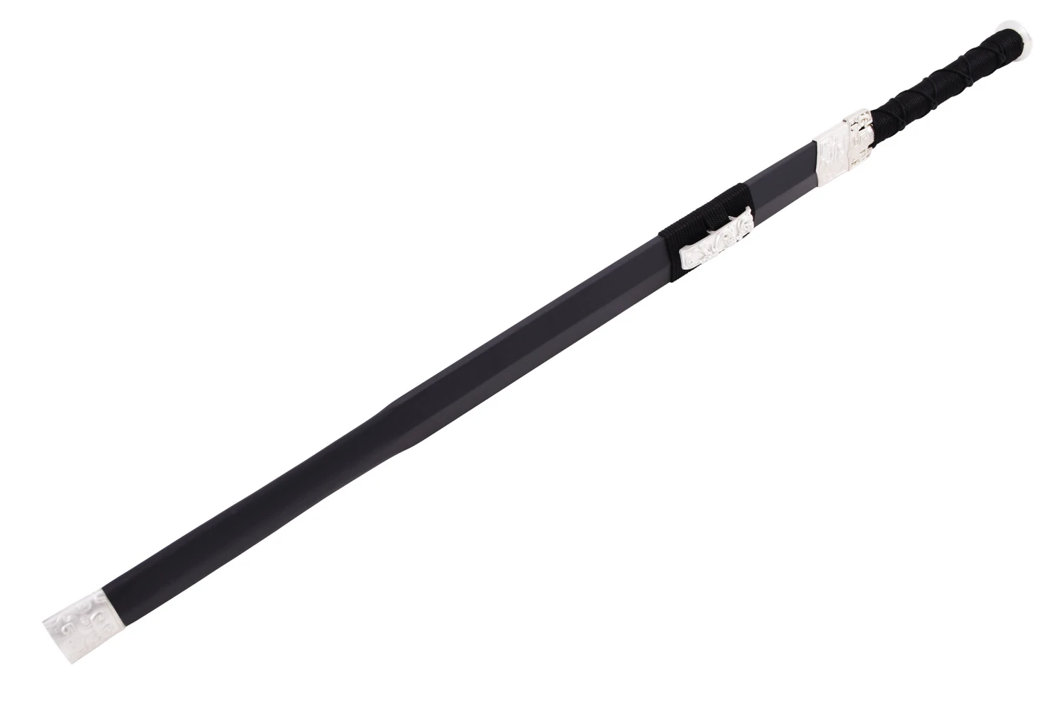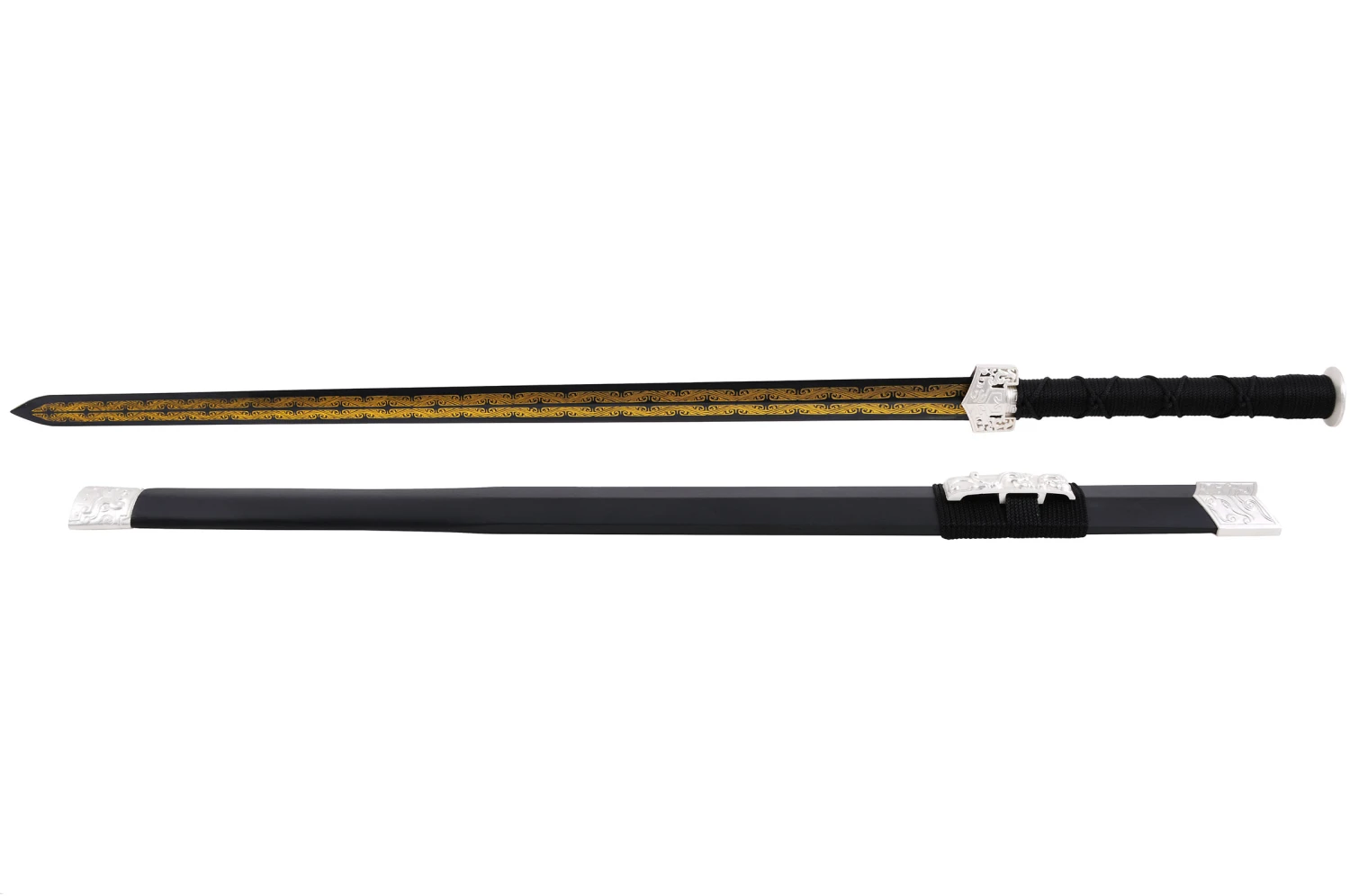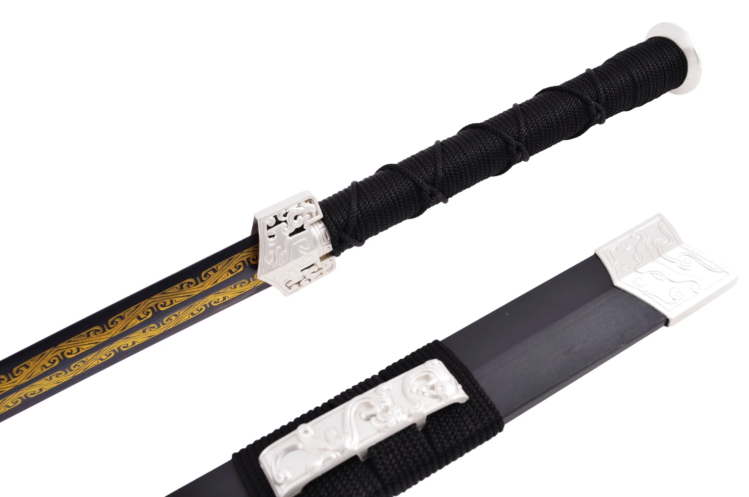 Épée avec fourreau noir, pièces ornementales en métal blanc et lame noire avec motif doré.