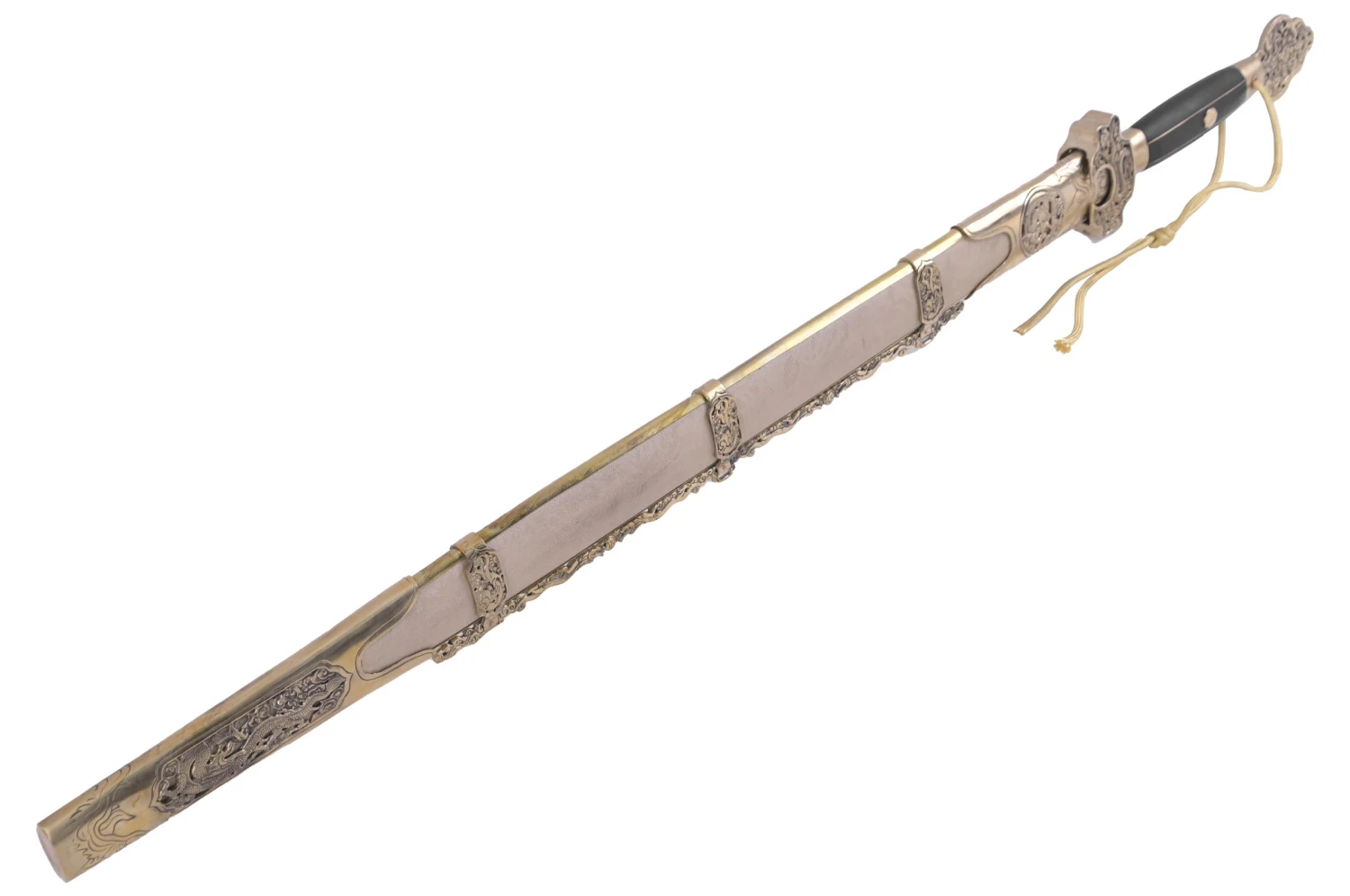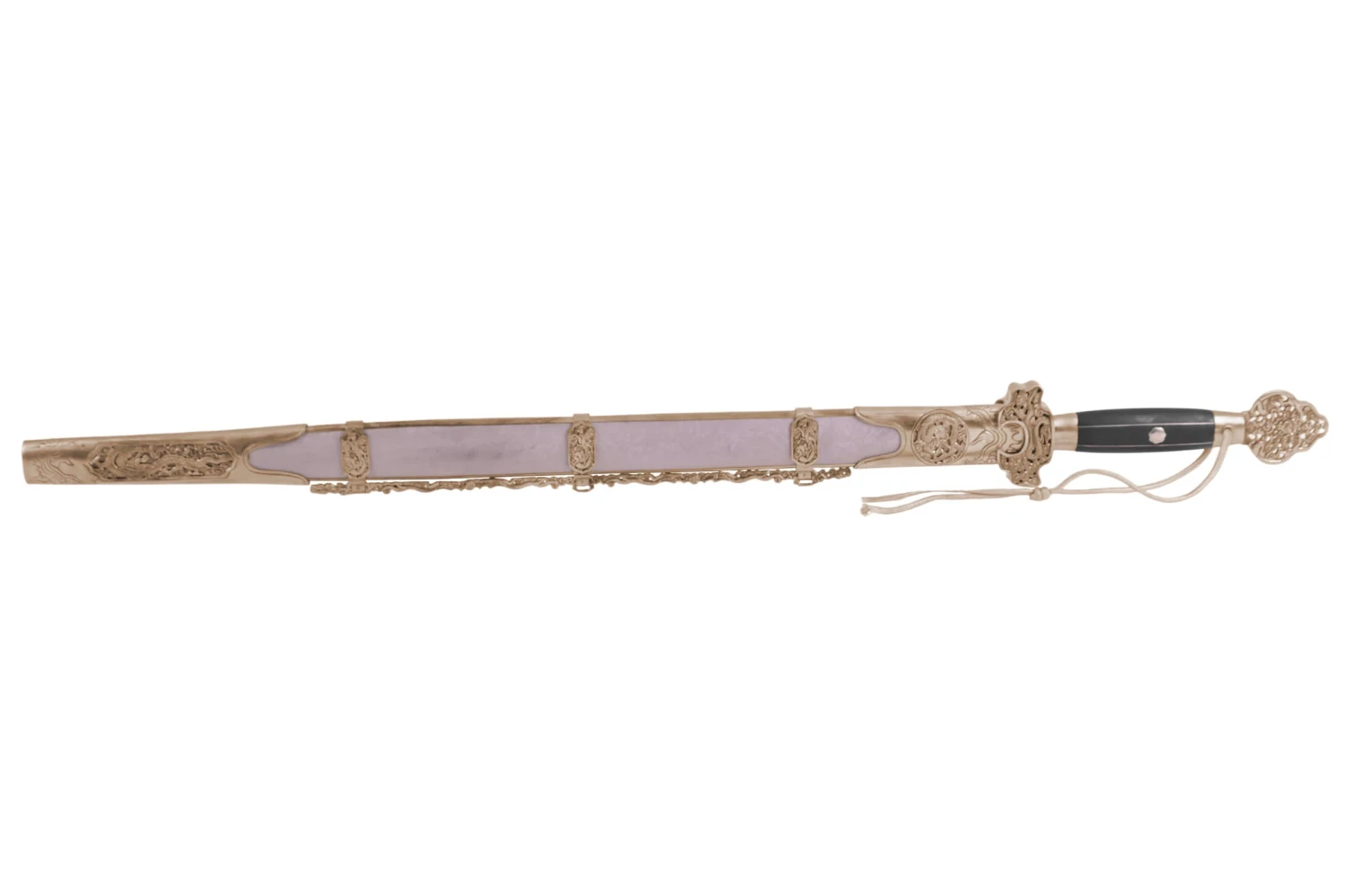 Richement doté d’ornements en laiton et d’un fourreau recouvert d’une imitation damas (tissu en soie) ivoire, le White Serpent présente un design caractéristique de l’ère Ming.