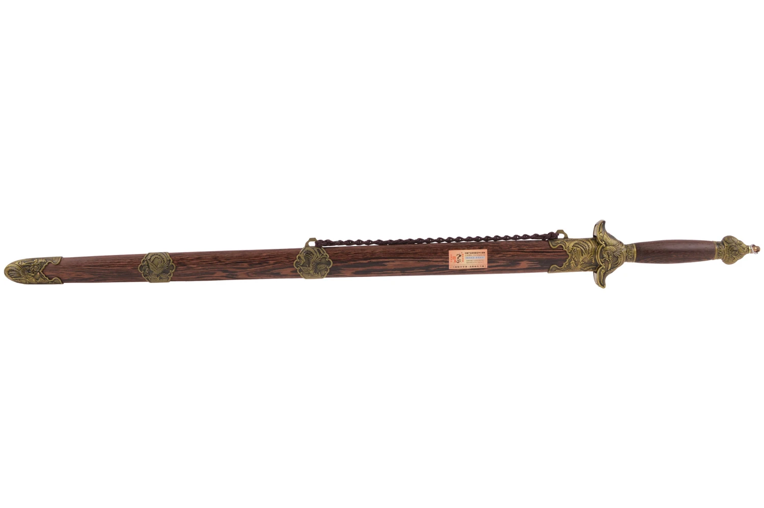 La forge YangShi est réputée pour le travail de qualité et les pièces ornementales, ici nous avons une magnifique épée de taiji de style Yang avec des pièces en Zamak finement travaillées et avec un motif de phénix gravé. Le fourreau en bois Wengé est parfaitement adapté à la lame.
