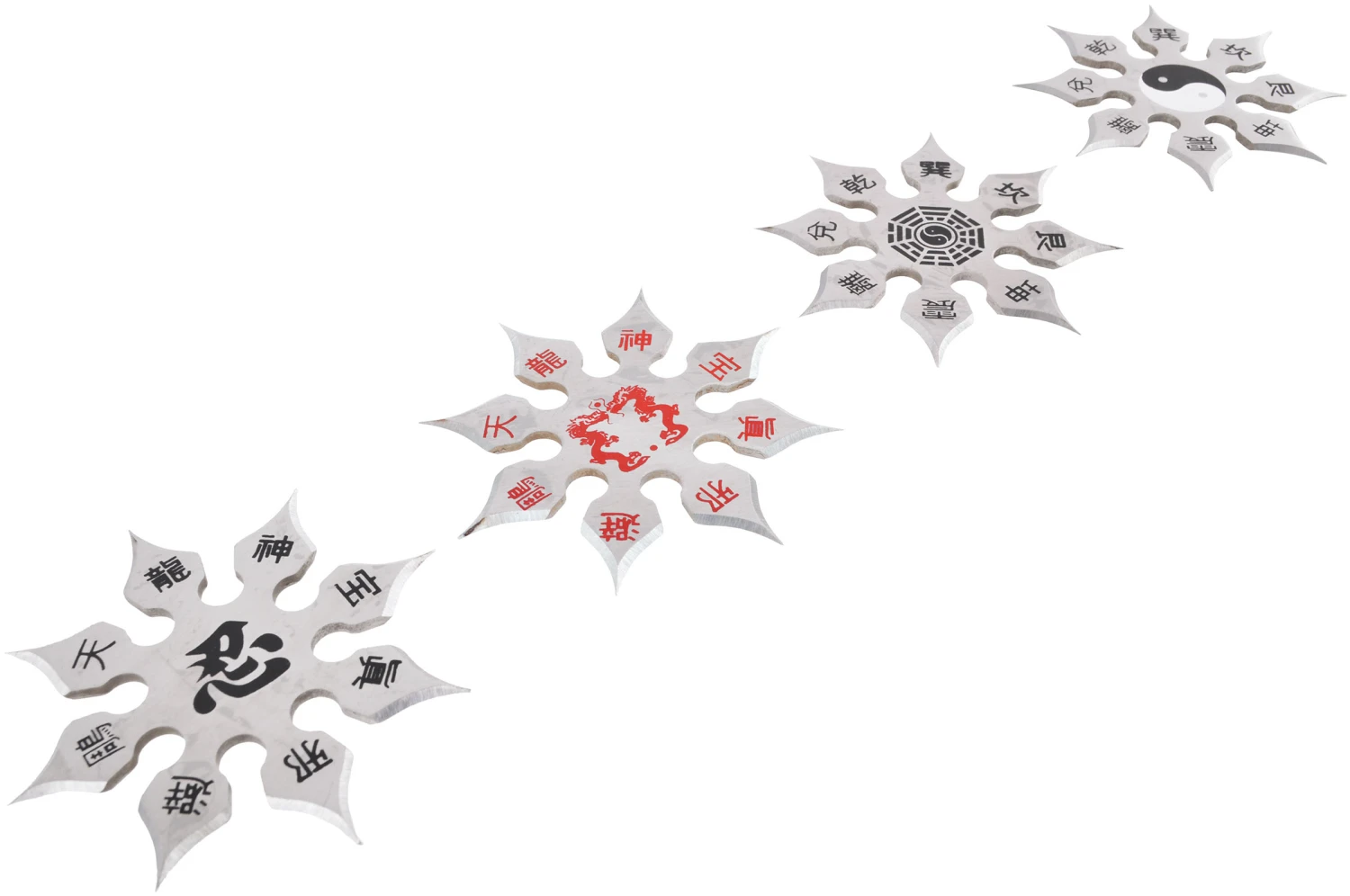 Lot de 4 Étoiles de Ninja en acier inoxydable à 8 branches avec un design aux caractères chinois, yin yang et dragon.