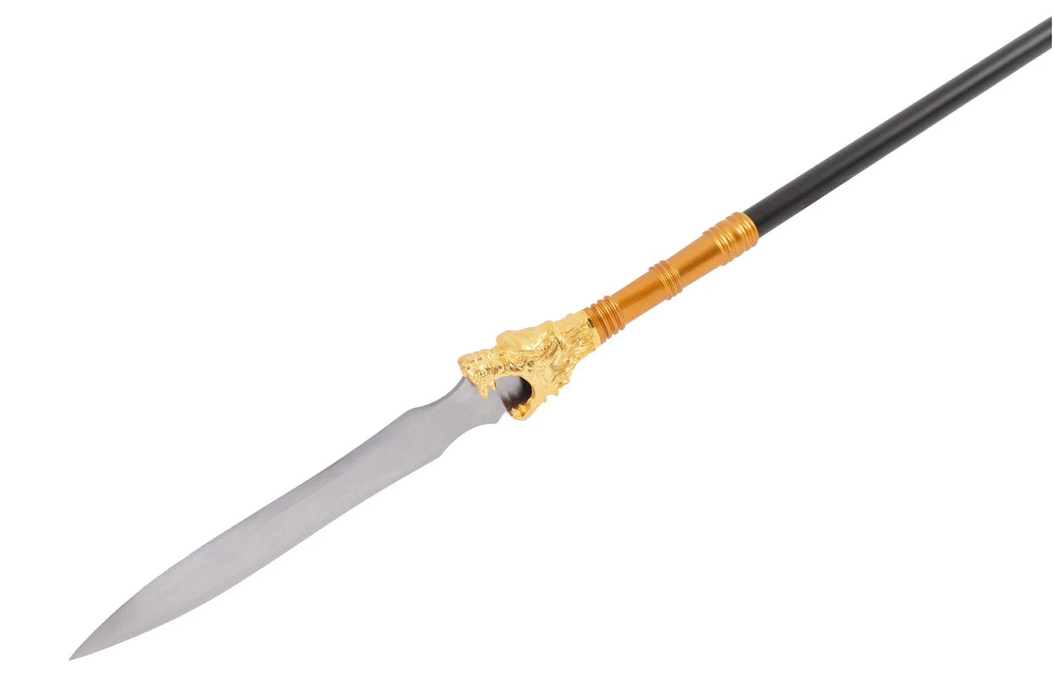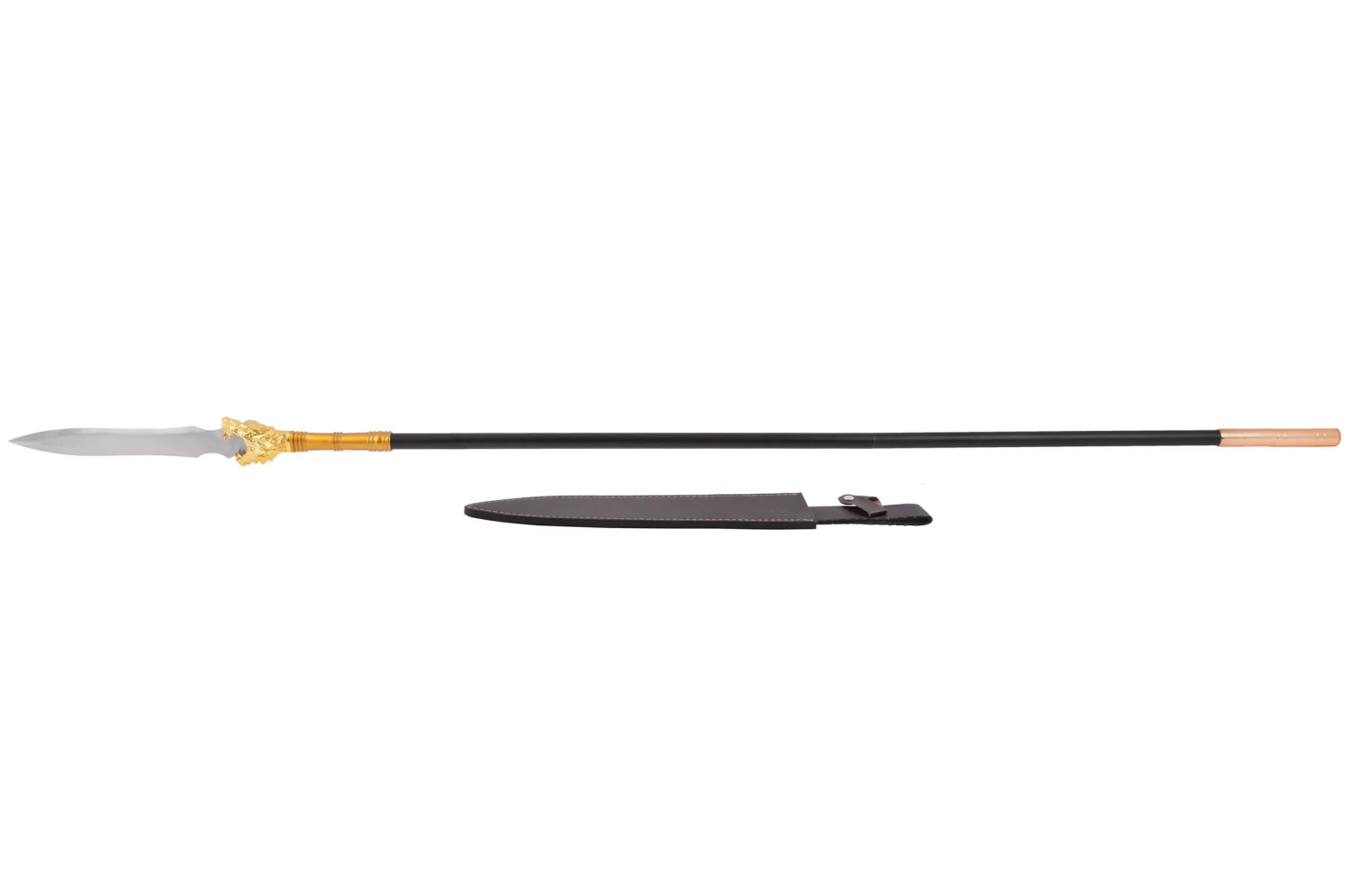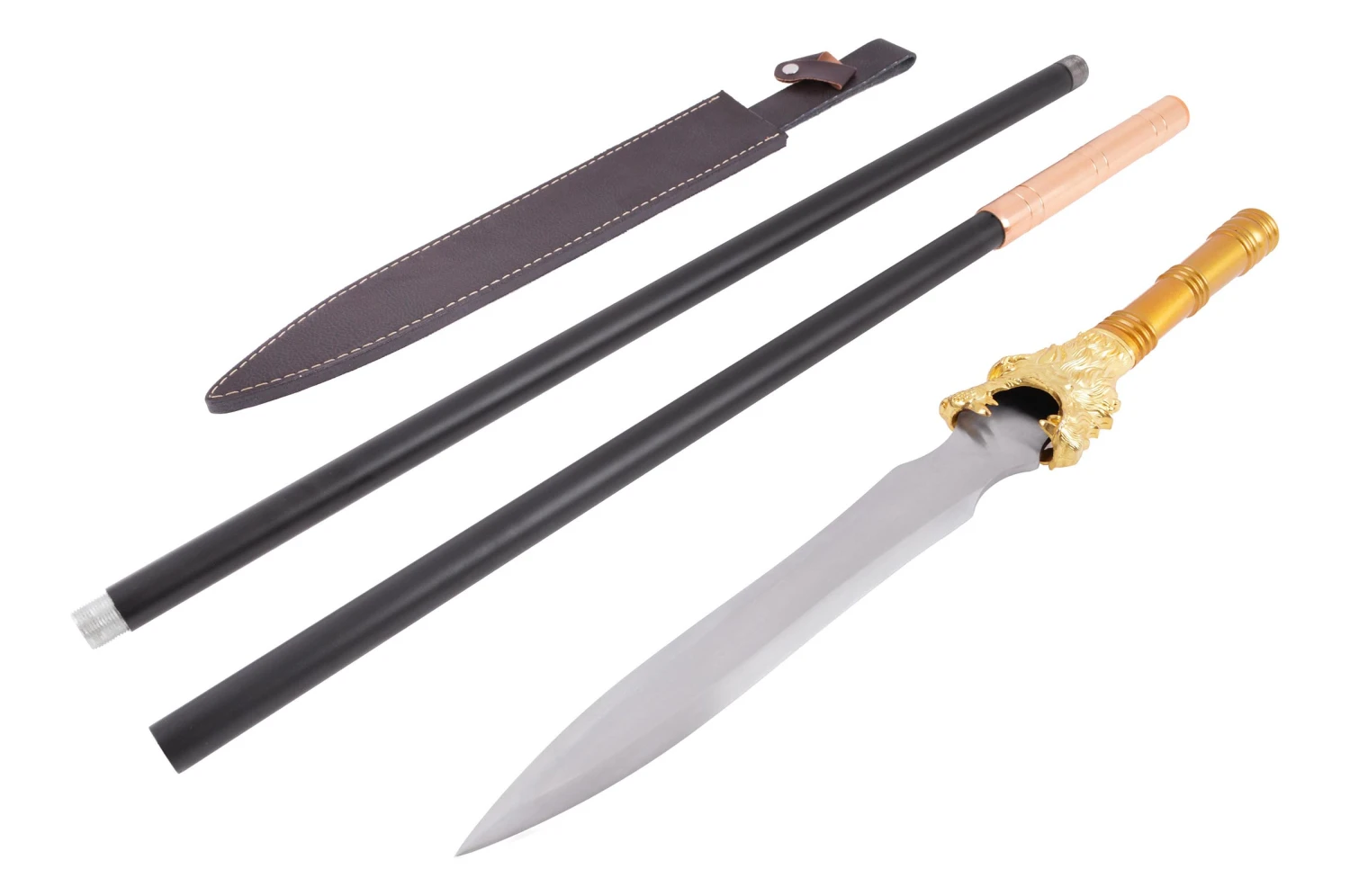 Lance démontable haut de gamme forgé à Longquan par Duan Ren Tang, lame en acier haute teneur manganese, ce qui donne à la lame de très beaux reflets. Un dragon en décoration dorée à la base de la lame, manche thermolacqué en noir.