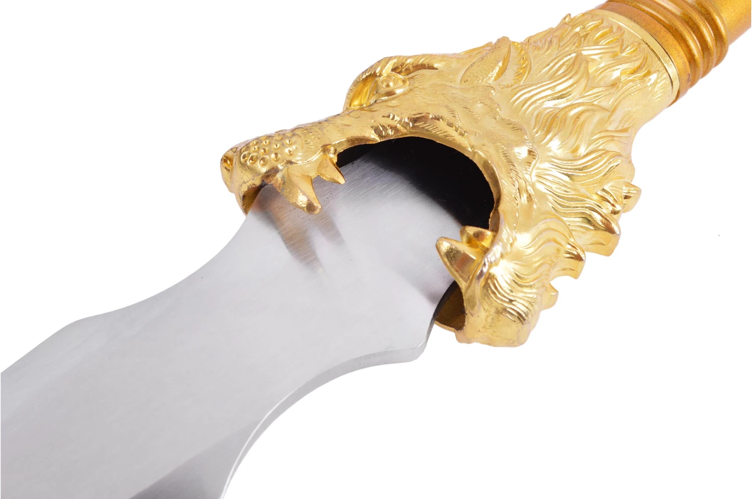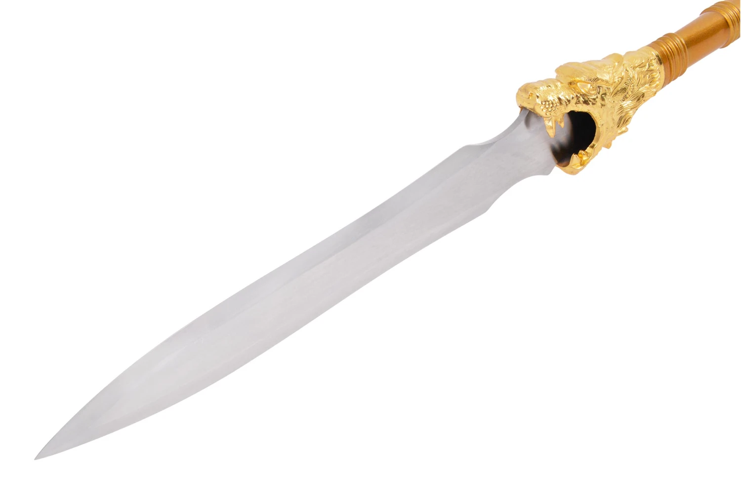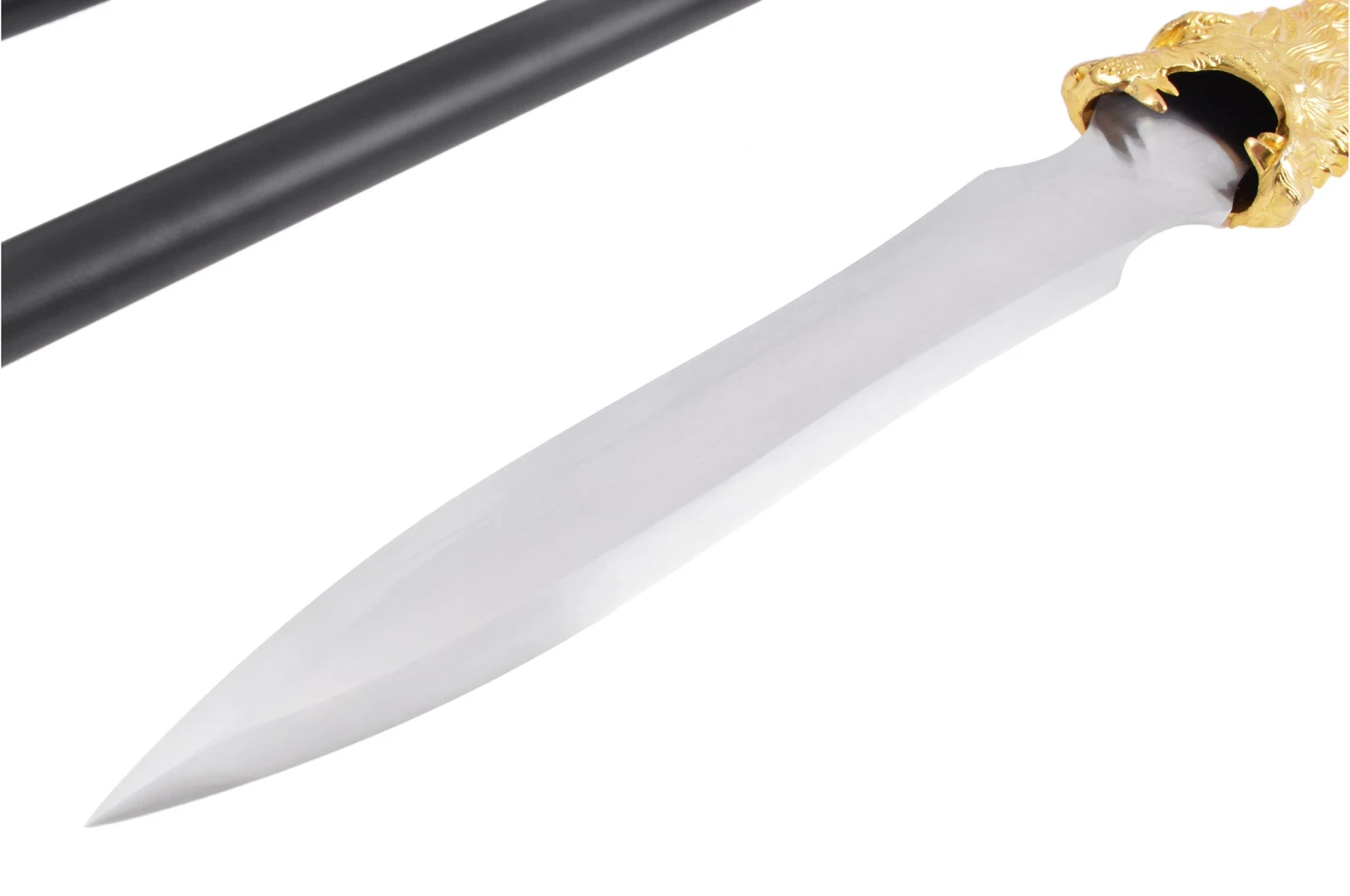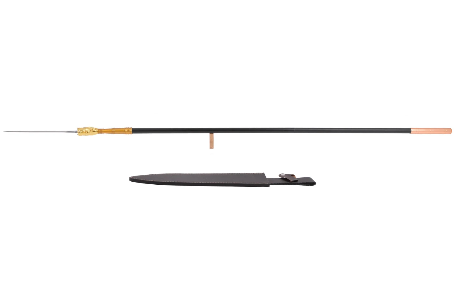 Lance démontable haut de gamme forgé à Longquan par Duan Ren Tang, lame en acier haute teneur manganese, ce qui donne à la lame de très beaux reflets. Un dragon en décoration dorée à la base de la lame, manche thermolacqué en noir.