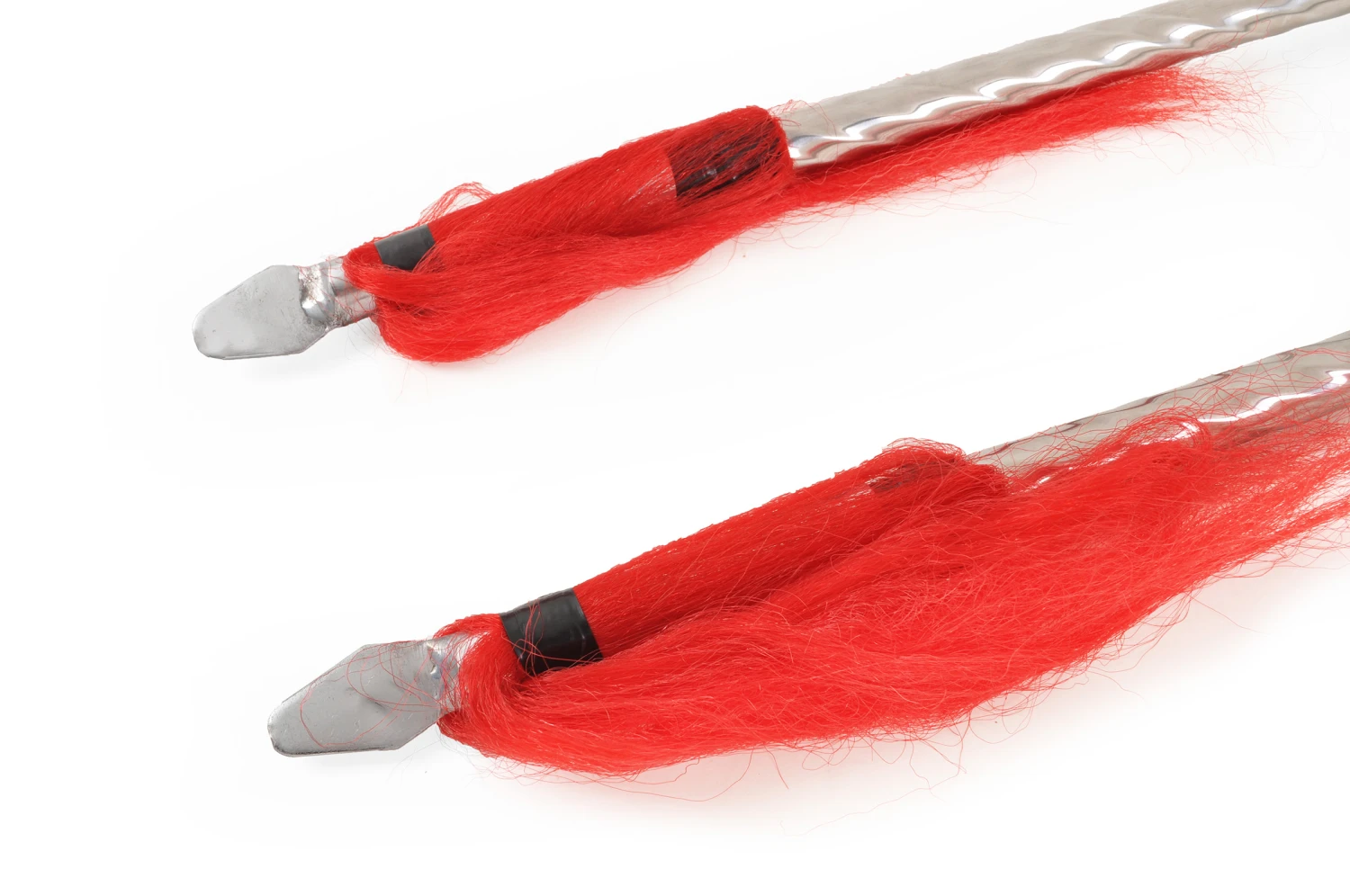 Paire de bâtons en acier inoxydable monté de deux pointes de lance, avec crin de cheval rouge en décoration et une bille à l’intérieur du bâton.