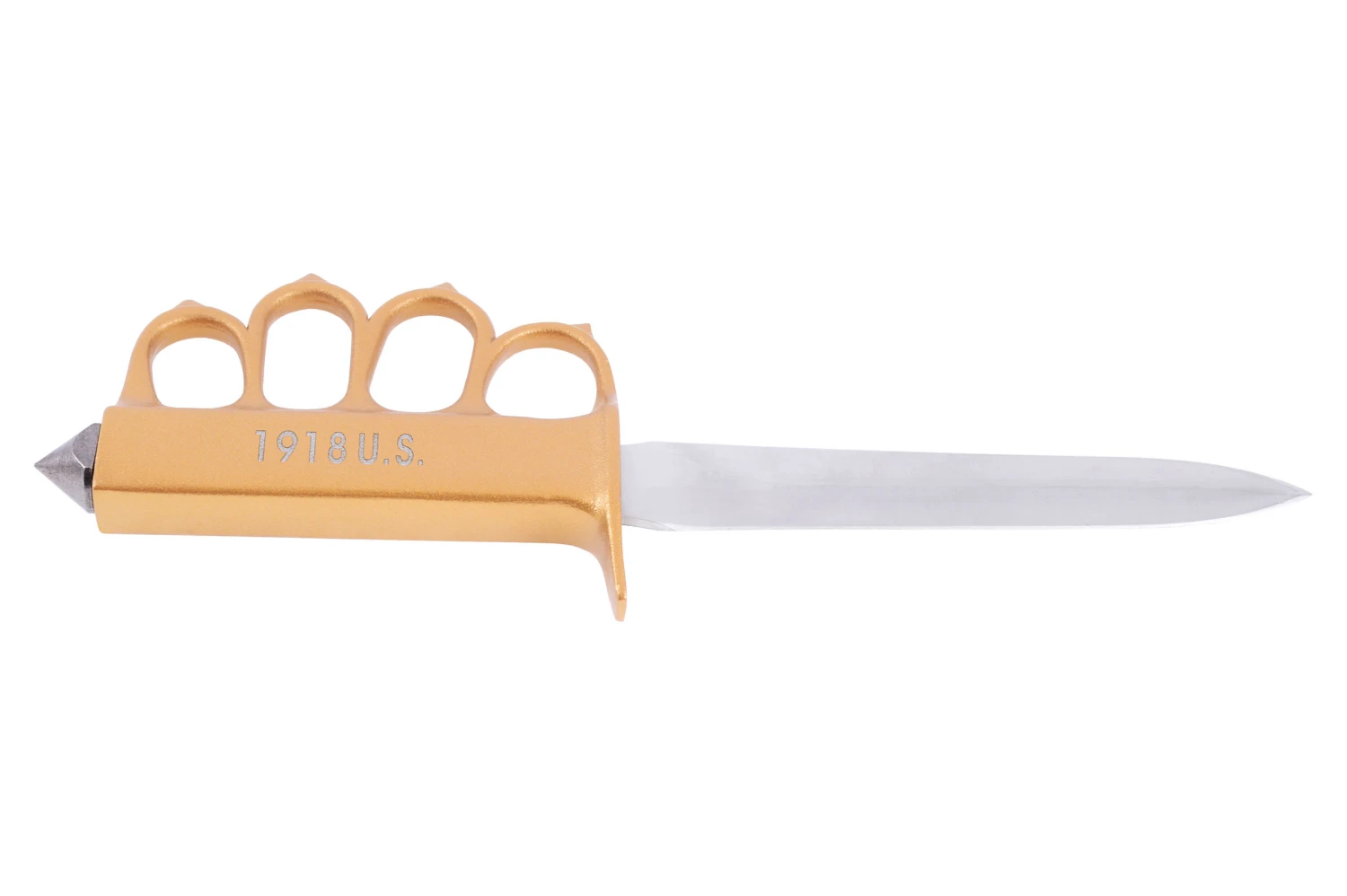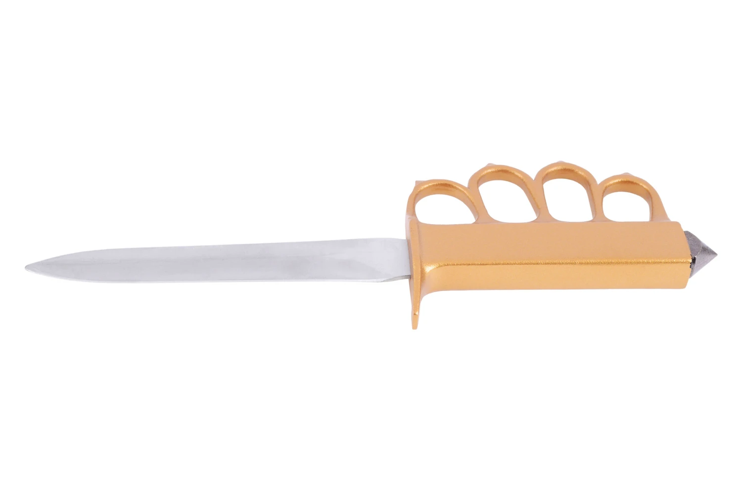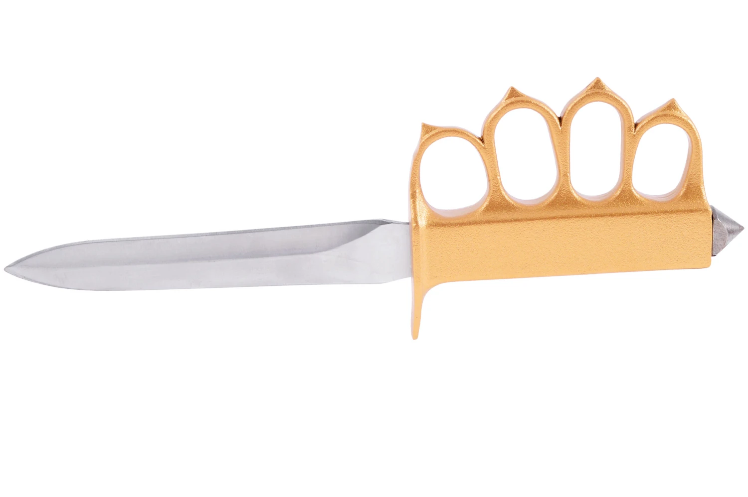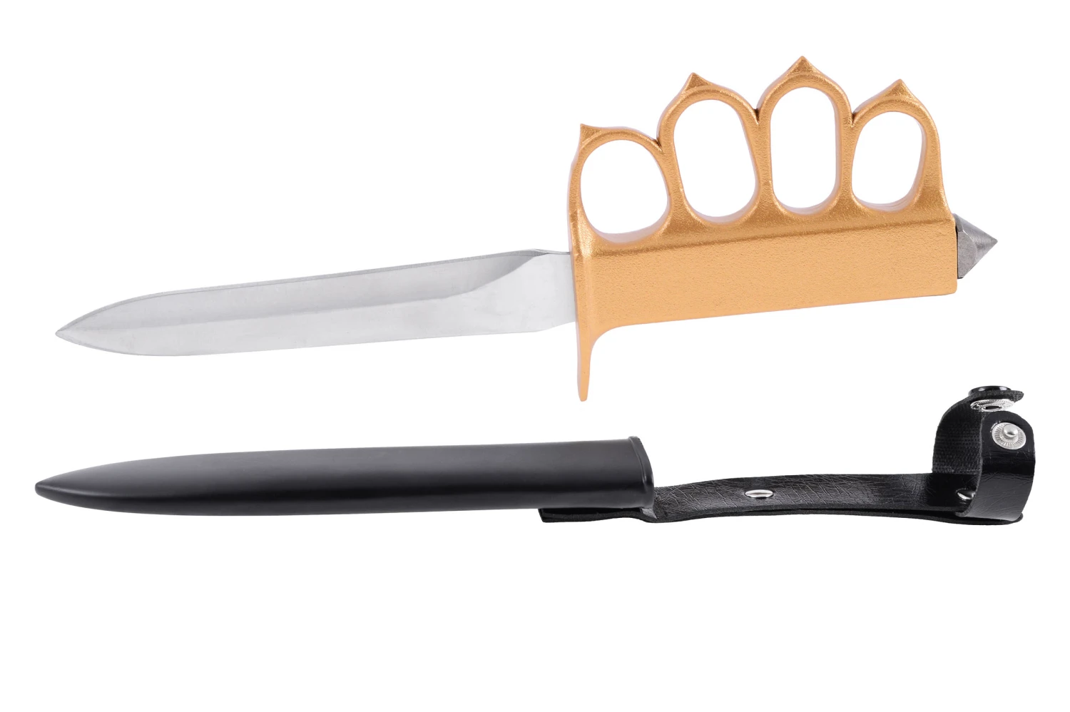 Poignard avec une lame en acier inoxydable de 15 cm et un manche Poing Américain en acier doré avec pointe en Acier Kubotan Brise vitre. Poignard vendu avec une gaine métallique avec attache en cuir.
