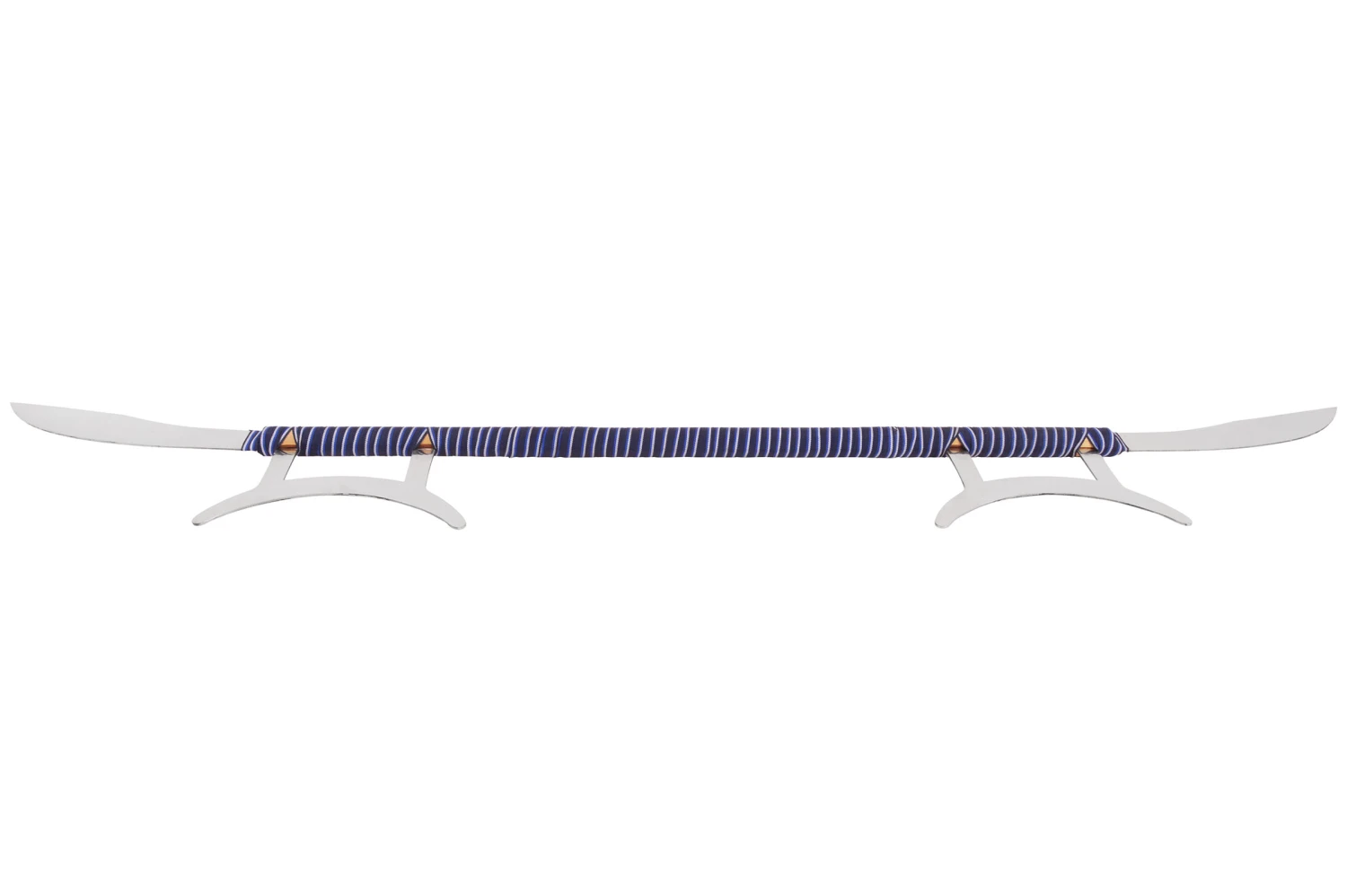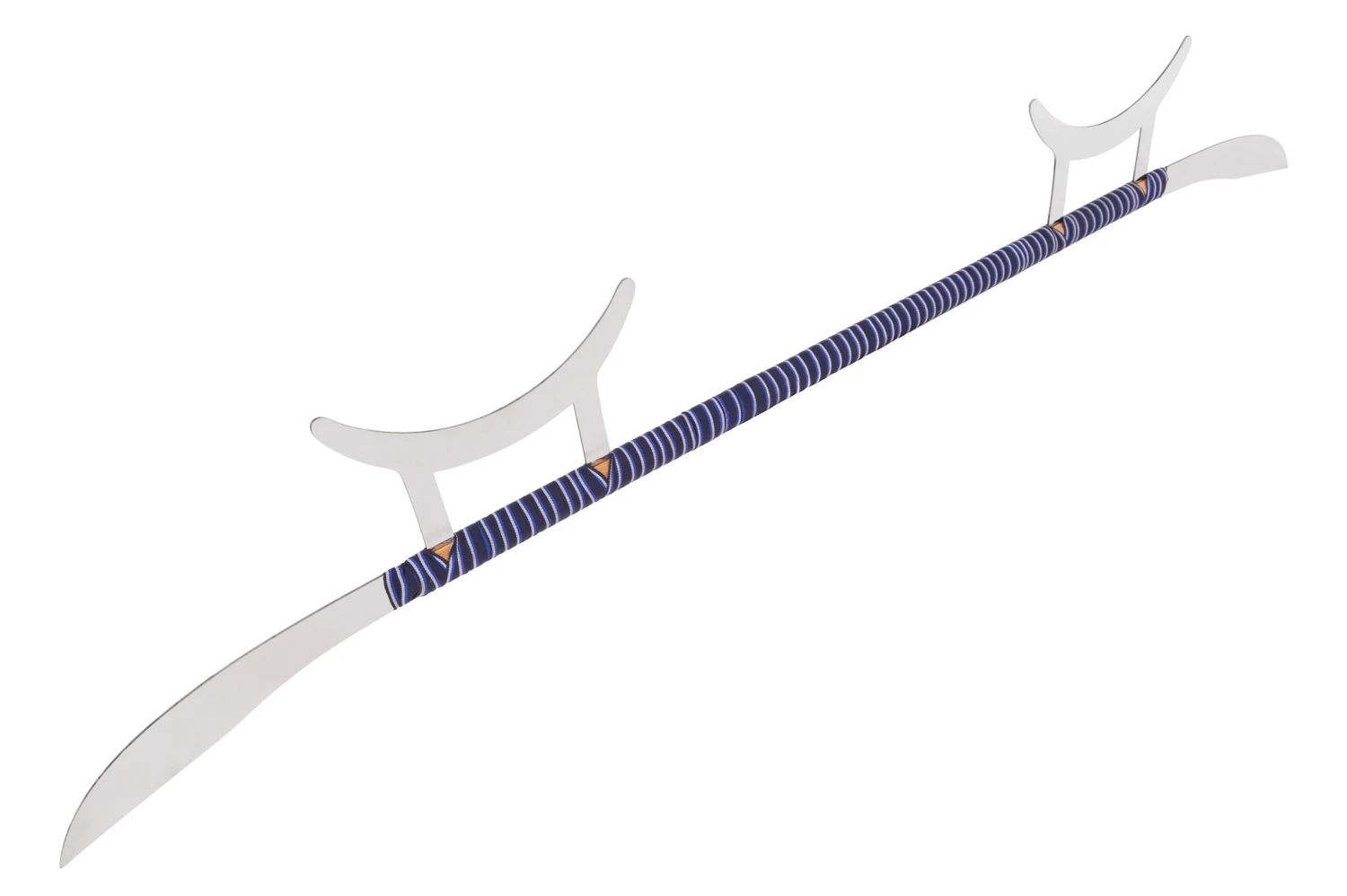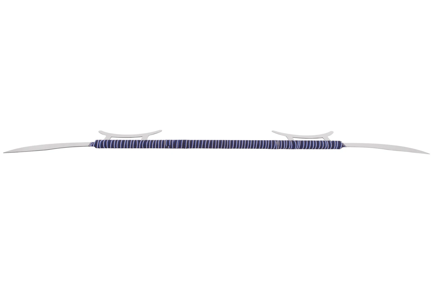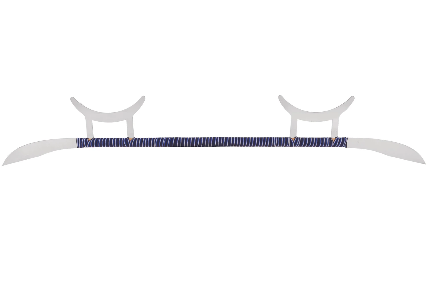 Sabre ailes de cigale, en acier chromé rigide. Les 2 croissants servent autant à repousser les adversaires qu’à servir de garde pour protéger les mains du porteur.