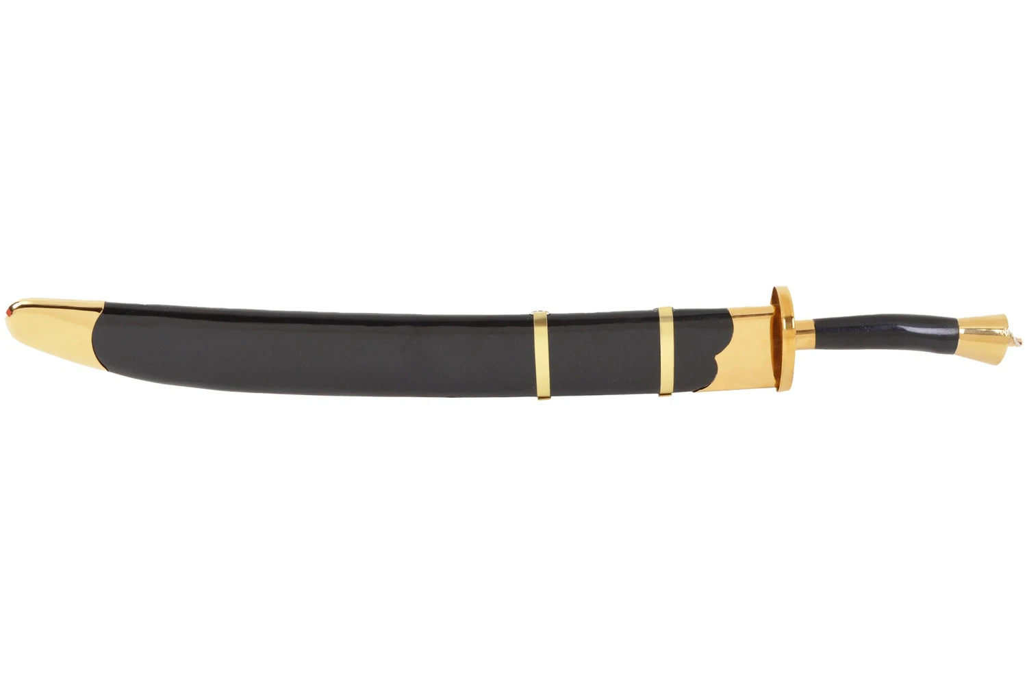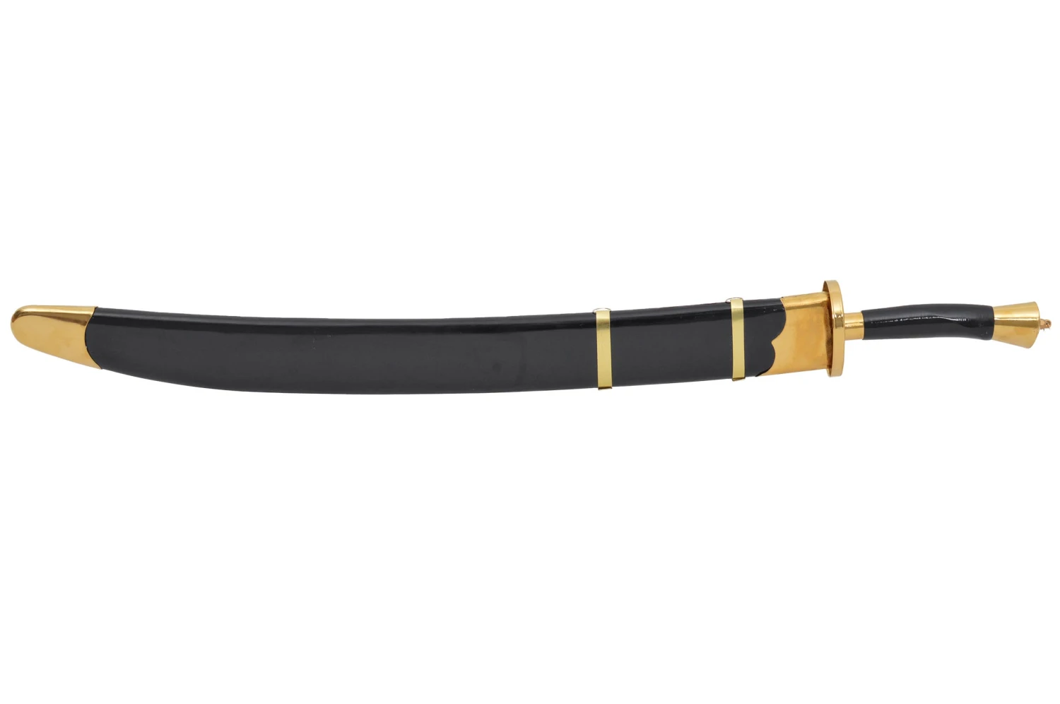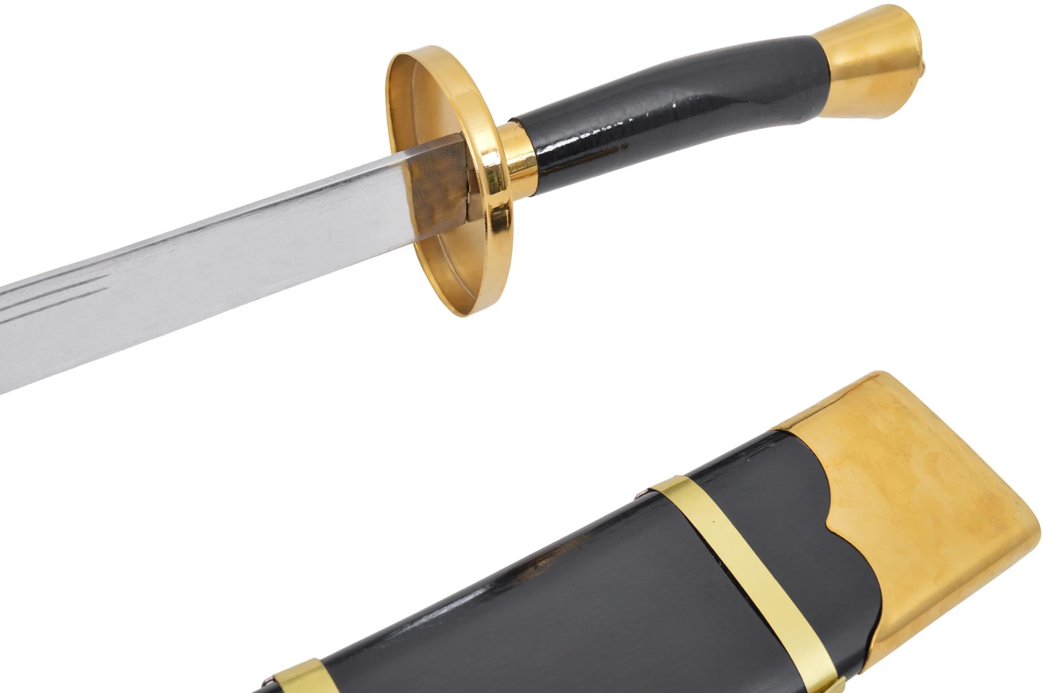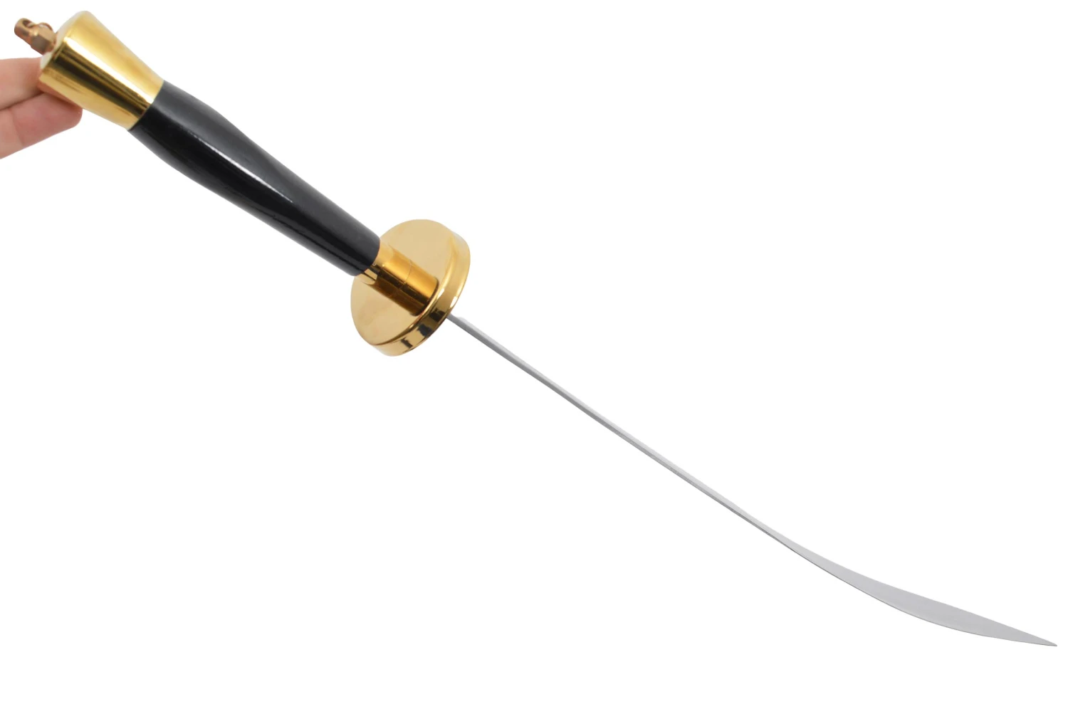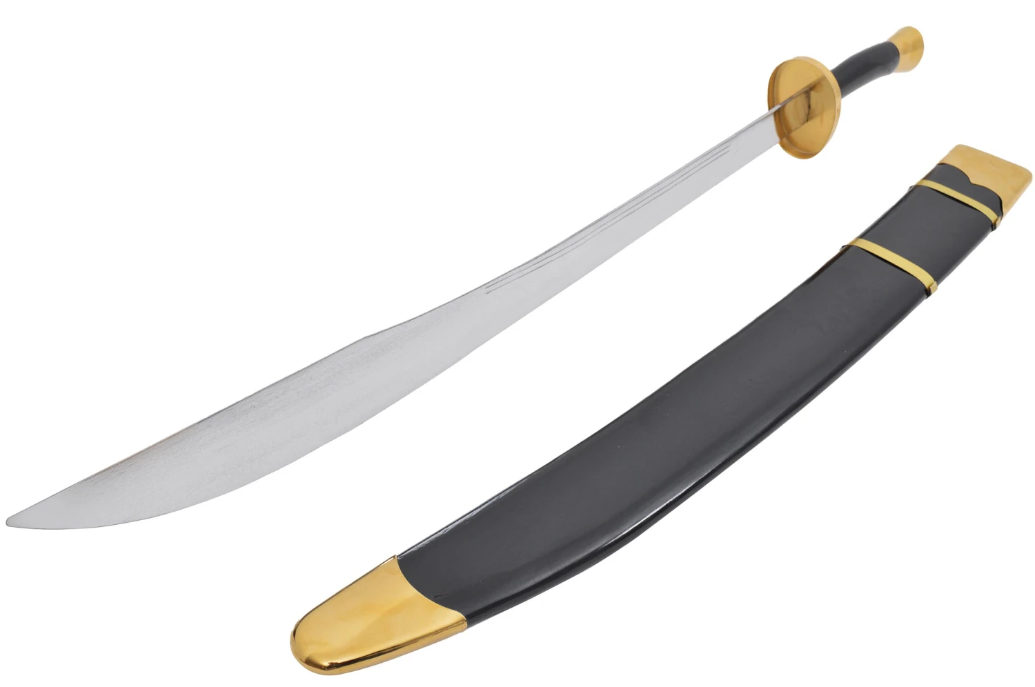 Sabre à lame semi flexible, comportant deux gouttières, dos de lame arrondi sans épaisseur. Poignée et fourreau en bois peint. Modèle milieu de gamme, vendu avec son fourreau.