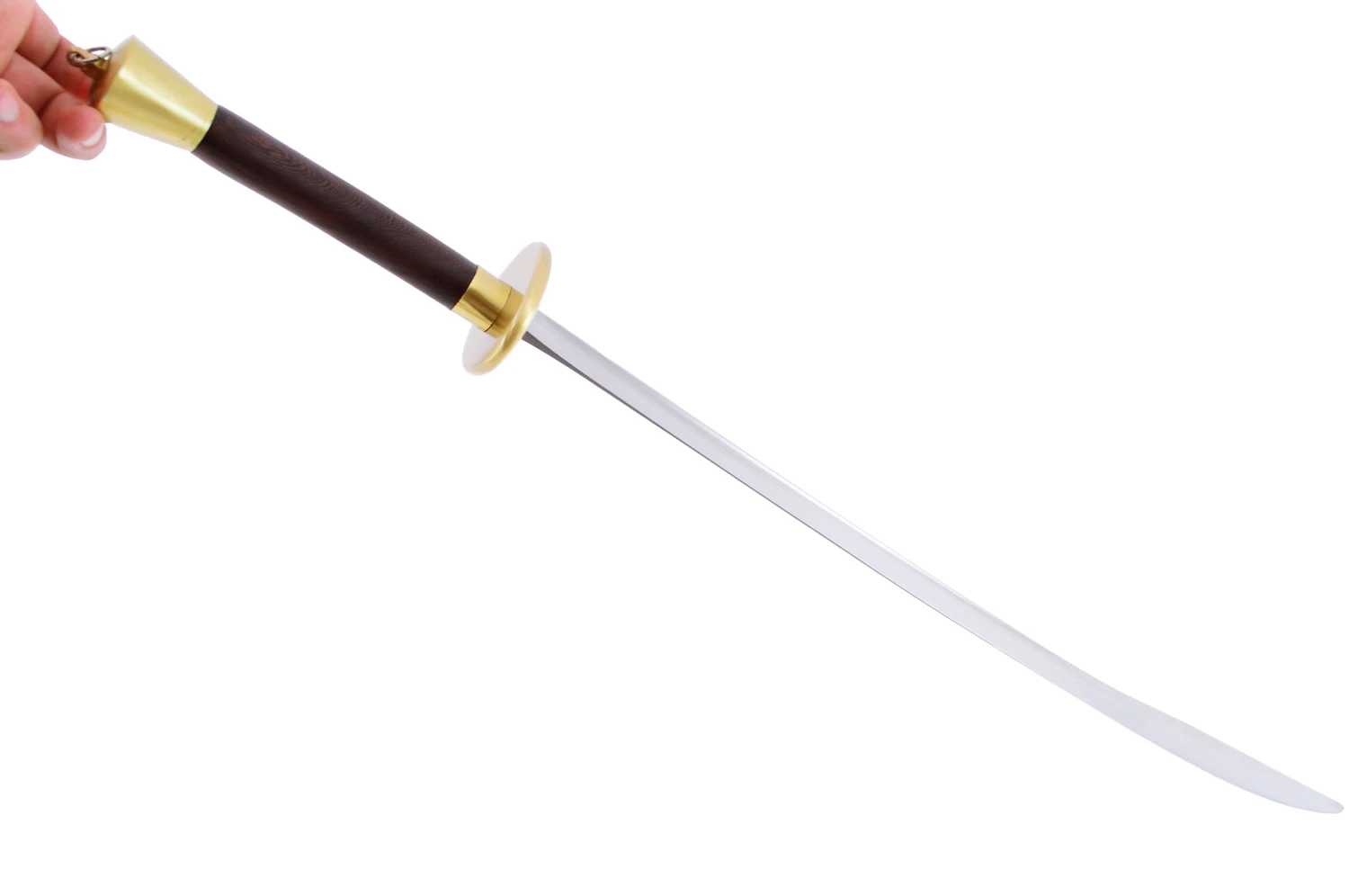 Sabre à lame rigide en acier inox brossé, poignée en bois, garde et pommeau dorés. La lame fine est rigide grâce à un renflement sur le dessus, ceci permet d’avoir une lame la plus légère possible tout en étant rigide.