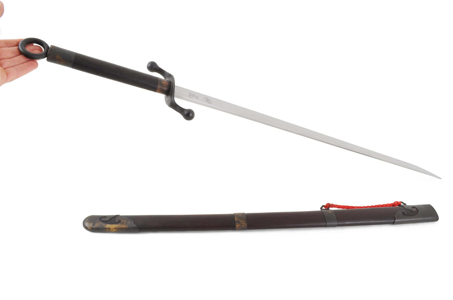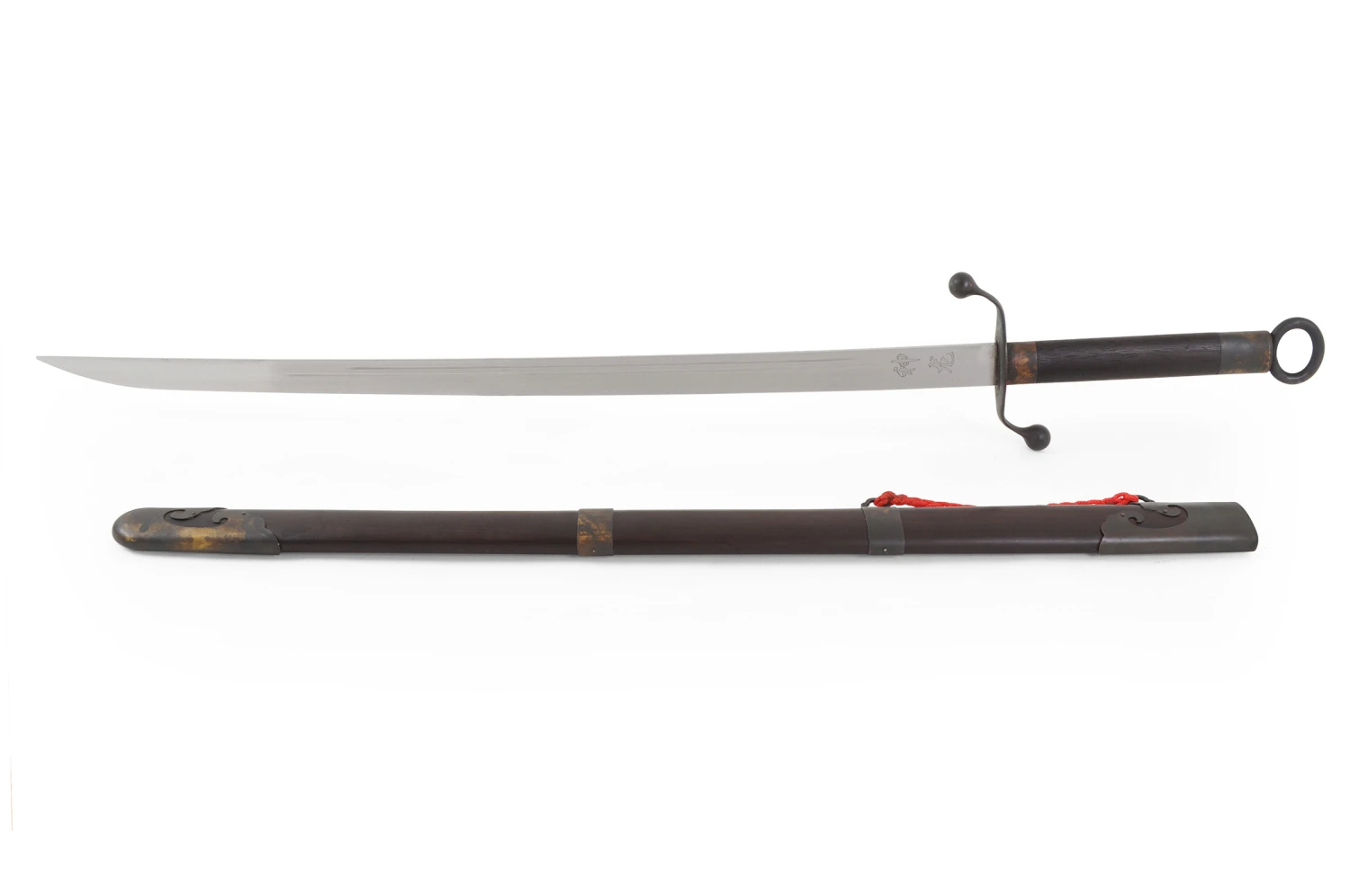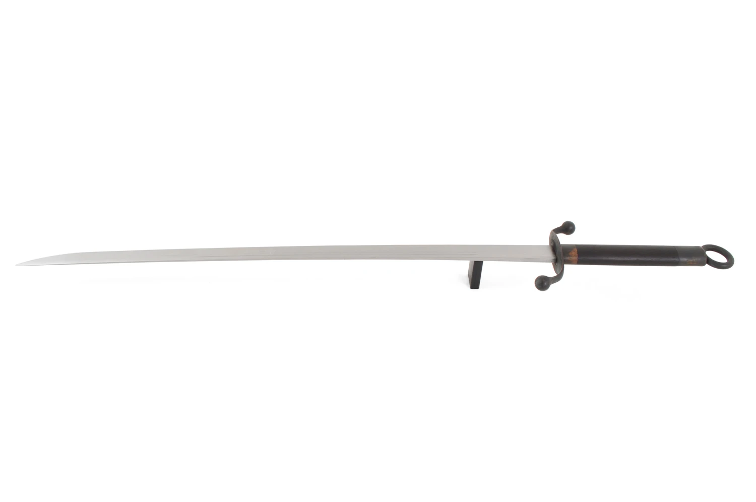 Voici une une arme haut de gamme, forgĂ©e Ă la main de manière traditionnelle, la lame rigide est faite d’un alliage acier carbone et manganèse, les parties cuivrĂ©es et en bois sont recouvertes d’une patine noire. RĂ©alisĂ©e dans les forges de Longquan. C’est un sabre de taiji style Chen.