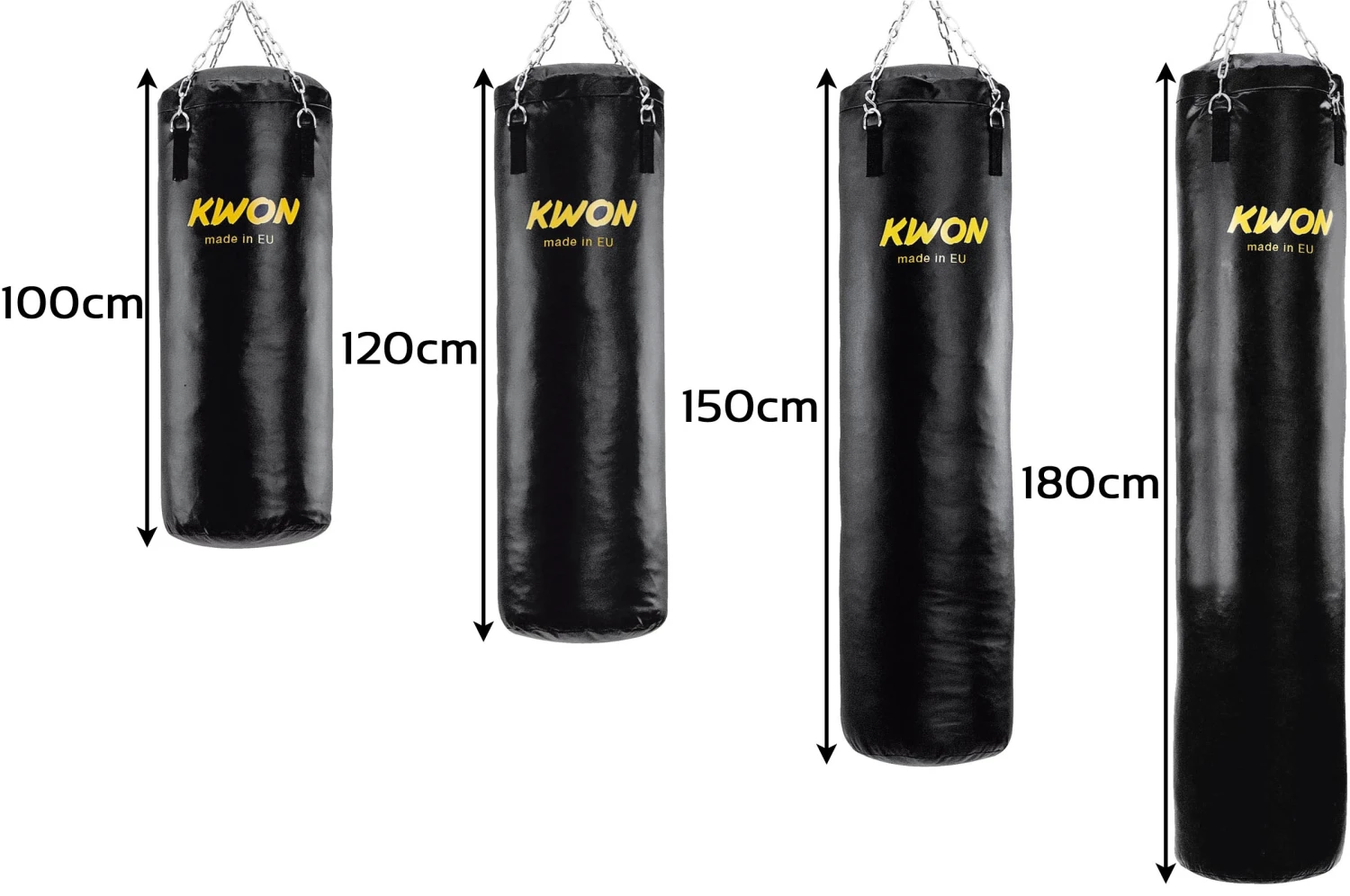En similicuir noir. La série renouvelée offre désormais un meilleur amortissement qui préserve le poignet et la cheville. Tous les sacs de frappe sont livrés avec une chaîne en acier inoxydable et une « Barre rotative » chromée.