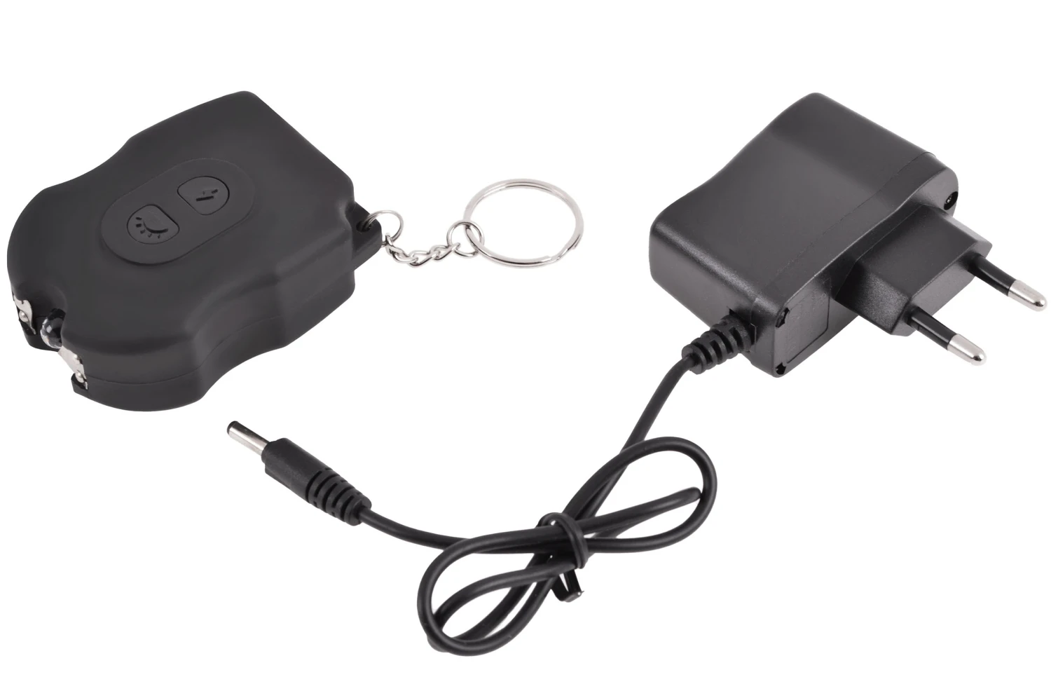 Shocker électrique de poche avec un anneau pour l’attacher à vos clés ou à un sac.