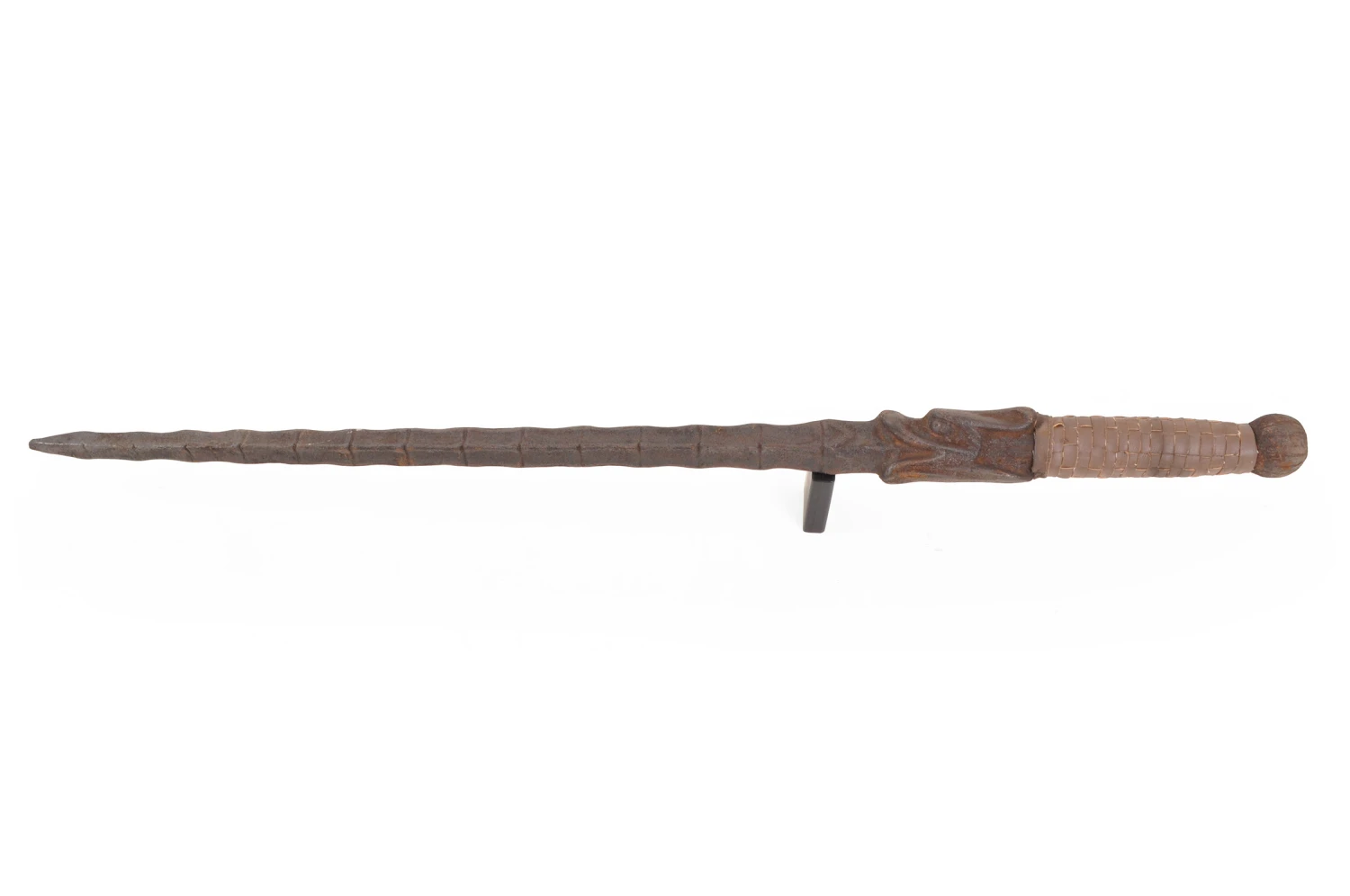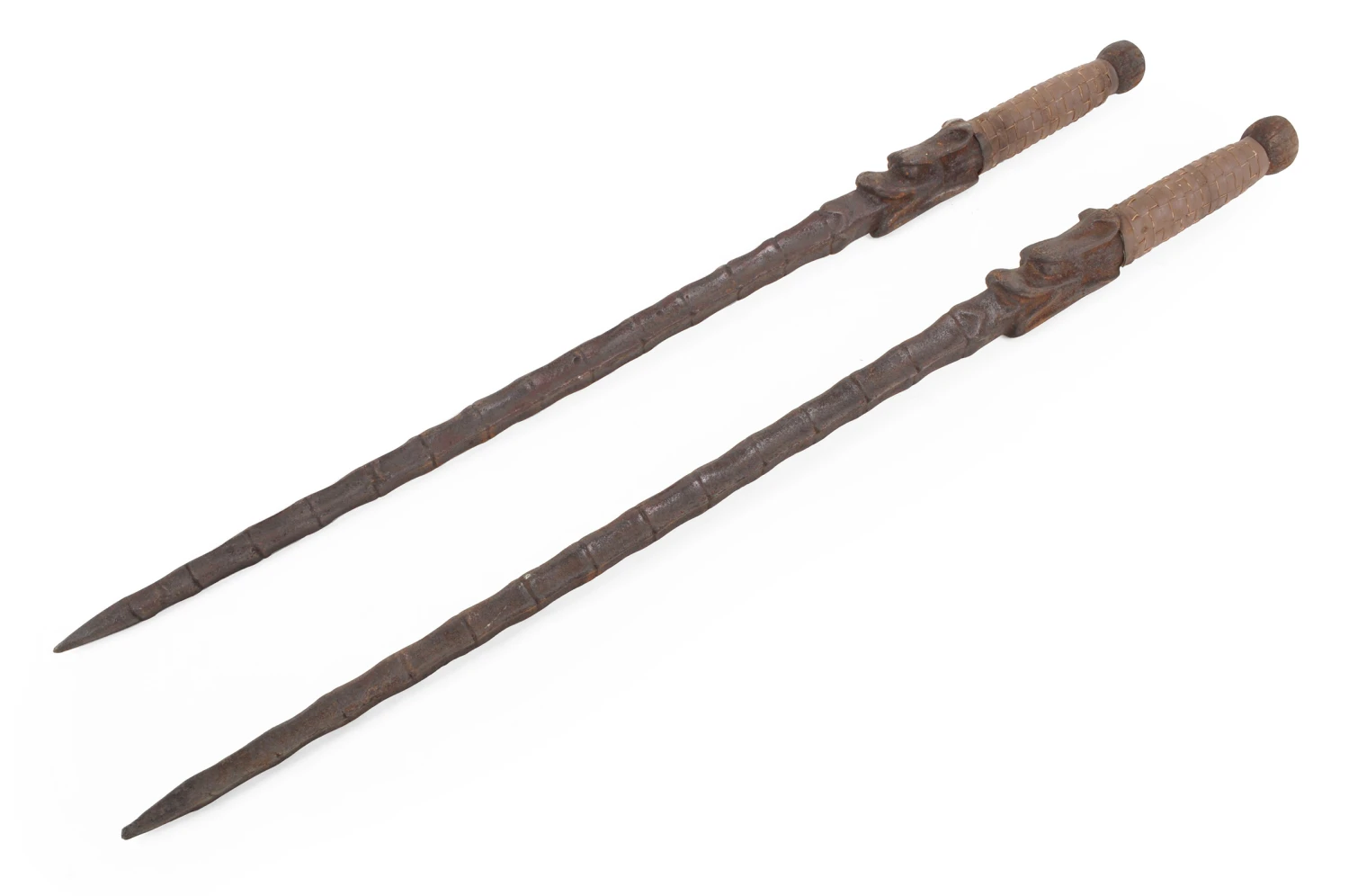 Les si leng jian sont une paire de massue, aussi appelés shuang jian (double épée). Poignées en métal plein (monobloc avec la lame), bien équilibré. Parfaite réplique, aspect authentiques avec ses lames oxydées.